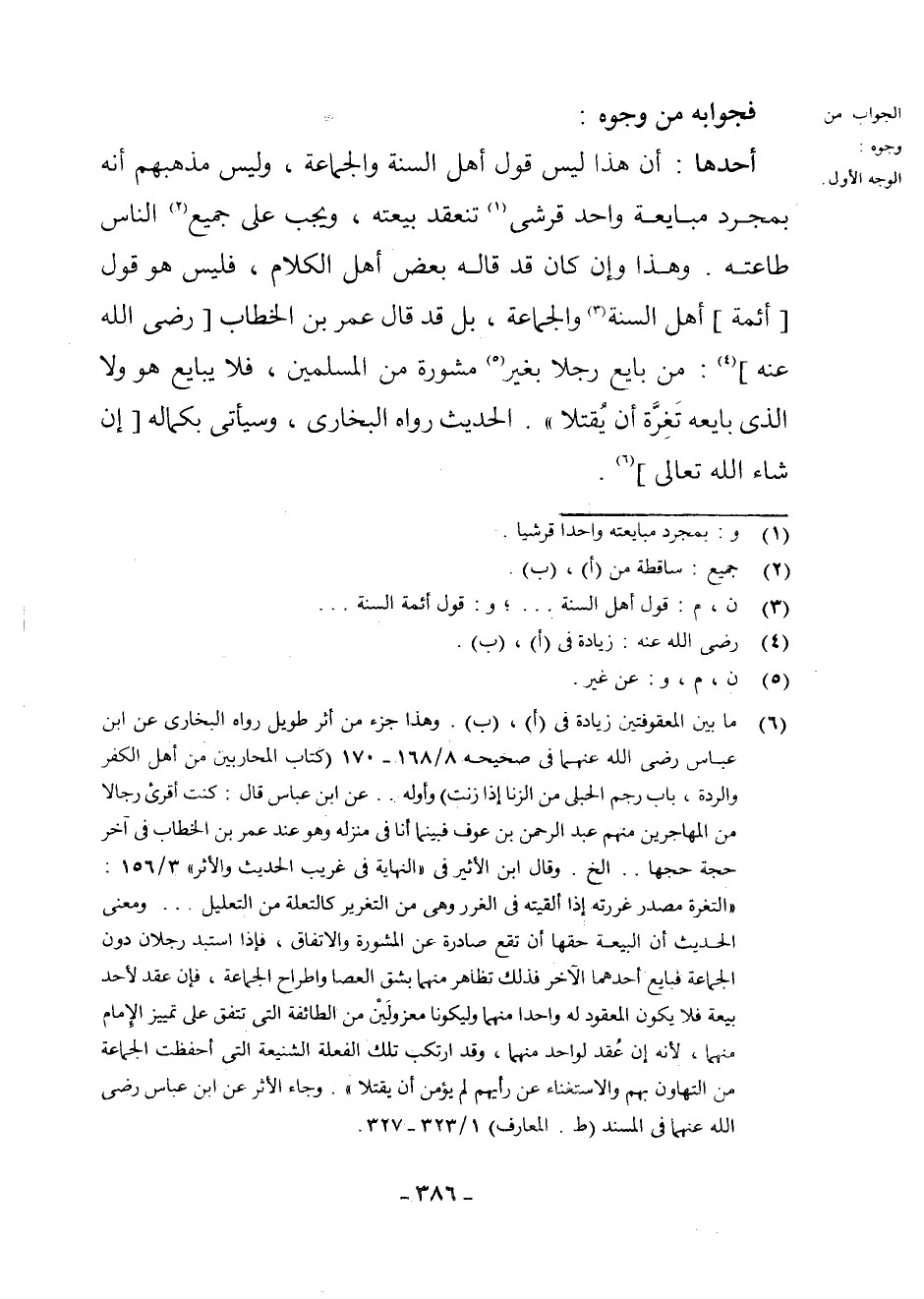 (¬6) مَا بَيْنَ الْمَعْقُوفَتَيْنِ زِيَادَةٌ فِي (أ) ، (ب) وَهَذَا جُزْءٌ مِنْ أَثَرٍ طَوِيلٍ رَوَاهُ الْبُخَارِيُّ عَنِ ابْنِ عَبَّاسٍ - رَضِيَ اللَّهُ عَنْهُمَا - فِي صَحِيحِهِ 8/168 - 170 (كِتَابُ الْمُحَارِبِينَ مِنْ أَهْلِ الْكُفْرِ وَالرِّدَّةِ، بَابُ رَجْمِ الْحُبْلَى مِنَ الزِّنَا إِذَا زَنَتْ) ، وَأَوَّلُهُ. . عَنِ ابْنِ عَبَّاسٍ قَالَ: كُنْتُ أُقْرِئُ رِجَالًا مِنَ الْمُهَاجِرِينَ مِنْهُمْ عَبْدُ الرَّحْمَنِ بْنُ عَوْفٍ، فَبَيْنَمَا أَنَا فِي مَنْزِلِهِ وَهُوَ عِنْدَ عُمَرَ بْنِ الْخَطَّابِ فِي آخِرِ حَجَّةٍ حَجَّهَا. . . إِلَخْ، وَقَالَ ابْنُ الْأَثِيرِ فِي النِّهَايَةِ فِي غَرِيبِ الْحَدِيثِ وَالْأَثَرِ 3/156: (التَّغِرَّةُ مَصْدَرُ غَرَرْتُهُ إِذَا أَلْقَيْتَهُ فِي الْغَرَرِ وَهِيَ مِنَ التَّغْرِيرِ كَالتَّعِلَّةِ وَالتَّعْلِيلِ، وَمَعْنَى الْحَدِيثِ أَنَّ الْبَيْعَةَ حَقُّهَا أَنْ تَقَعَ صَادِرَةً عَنِ الْمَشْهُورَةِ وَالِاتِّفَاقِ، فَإِذَا اسْتَبَدَّ رَجُلَانِ دُونَ الْجَمَاعَةِ فَبَايَعَ أَحَدُهُمَا الْآخَرَ فَذَلِكَ تَظَاهُرٌ مِنْهُمَا بِشَقِّ الْعَصَا وَاطِّرَاحِ الْجَمَاعَةِ، فَإِنْ عُقِدَ لِأَحَدٍ بَيْعَةٌ فَلَا يَكُونُ الْمَعْقُودُ لَهُ وَاحِدًا مِنْهُمَا وَلِيَكُونَا مَعْزُولَيْنِ مِنَ الطَّائِفَةِ الَّتِي تَتَّفِقُ عَلَى تَمْيِيزِ الْإِمَامِ مِنْهُمَا، لِأَنَّهُ إِنْ عُقِدَ لِوَاحِدٍ مِنْهُمَا، وَقَدِ ارْتَكَبَ تِلْكَ الْفَعْلَةَ الشَّنِيعَةَ الَّتِي أَحْفَظَتِ الْجَمَاعَةَ مِنَ التَّهَاوُنِ بِهِمْ وَالِاسْتِغْنَاءِ عَنْ رَأْيِهِمْ لَمْ يُؤْمَنْ أَنْ يُقْتَلَا) وَجَاءَ الْأَثَرُ عَنِ ابْنِ عَبَّاسٍ - رَضِيَ اللَّهُ عَنْهُمَا - فِي الْمُسْنَدِ (ط. الْمَعَارِفِ) 1/323 - 327.