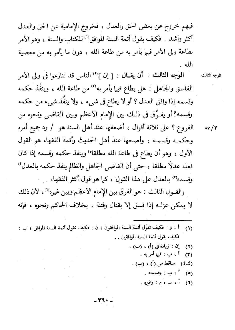 الْوَجْهُ الثَّالِثُ أَنْ يُقَالَ: إِنَّ (¬2) النَّاسَ قَدْ تَنَازَعُوا فِي وَلِيِّ الْأَمْرِ الْفَاسِقِ وَالْجَاهِلِ: هَلْ يُطَاعُ فِيمَا يَأْمُرُ بِهِ (¬3) مِنْ طَاعَةِ اللَّهِ، وَيُنَفَّذُ حُكْمُهُ وَقَسْمُهُ إِذَا وَافَقَ الْعَدْلَ؟ أَوْ لَا يُطَاعُ فِي شَيْءٍ، وَلَا يُنَفَّذُ شَيْءٌ مِنْ حُكْمِهِ وَقَسْمِهِ؟ أَوْ يُفَرَّقُ فِي ذَلِكَ بَيْنَ الْإِمَامِ الْأَعْظَمِ وَبَيْنَ الْقَاضِي وَنَحْوِهِ مِنَ الْفُرُوعِ؟ عَلَى ثَلَاثَةِ أَقْوَالٍ: أَضْعَفُهَا عِنْدَ أَهْلِ السُّنَّةِ: هُوَ رَدُّ جَمِيعِ أَمْرِهِ وَحُكْمِهِ وَقَسْمِهِ، وَأَصَحُّهَا عِنْدَ أَهْلِ الْحَدِيثِ وَأَئِمَّةِ الْفُقَهَاءِ هُوَ الْقَوْلُ الْأَوَّلُ وَهُوَ: أَنْ يُطَاعَ فِي طَاعَةِ اللَّهِ مُطْلَقًا وَيُنَفَّذَ حُكْمُهُ وَقَسْمُهُ إِذَا كَانَ فِعْلُهُ عَدْلًا مُطْلَقًا، حَتَّى أَنَّ الْقَاضِيَ الْجَاهِلَ وَالظَّالِمَ يُنَفَّذُ حُكْمُهُ بِالْعَدْلِ (¬4) وَقَسْمُهُ (¬5) بِالْعَدْلِ عَلَى هَذَا الْقَوْلِ، كَمَا هُوَ قَوْلُ أَكْثَرِ الْفُقَهَاءِ.