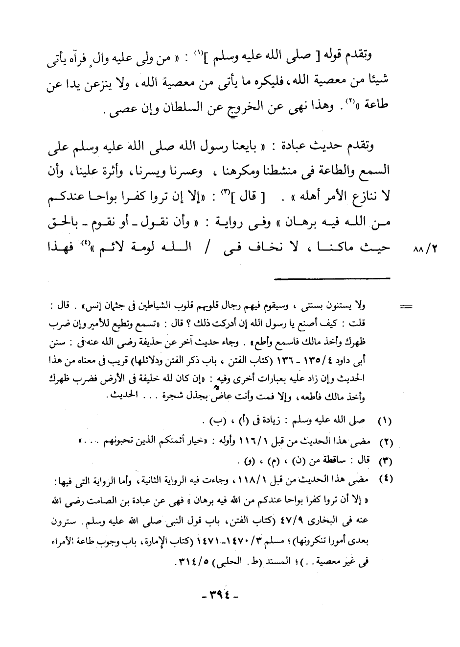 (¬4) مَضَى هَذَا الْحَدِيثُ مِنْ قَبْلُ 1/118، وَجَاءَتْ فِيهِ الرِّوَايَةُ الثَّانِيَةُ، وَأَمَّا الرِّوَايَةُ الَّتِي فِيهَا: إِلَّا أَنْ تَرَوْا كُفْرًا بَوَاحًا عِنْدَكُمْ مِنَ اللَّهِ فِيهِ بِرِهَانٌ. فَهِيَ عَنْ عُبَادَةَ بْنِ الصَّامِتِ - رَضِيَ اللَّهُ عَنْهُ - فِي الْبُخَارِيِّ 9/47 (كِتَابُ الْفِتَنِ، بَابُ قَوْلِ النَّبِيِّ - صَلَّى اللَّهُ عَلَيْهِ وَسَلَّمَ -: سَتَرَوْنَ بَعْدِي أُمُورًا تُنْكِرُونَهَا) ، مُسْلِمٍ 3/1470 - 1471 (كِتَابُ الْإِمَارَةِ، بَابُ وُجُوبِ طَاعَةِ الْأُمَرَاءِ فِي غَيْرِ مَعْصِيَةٍ) ، الْمُسْنَدِ (ط. الْحَلَبِيِّ) 5/314
