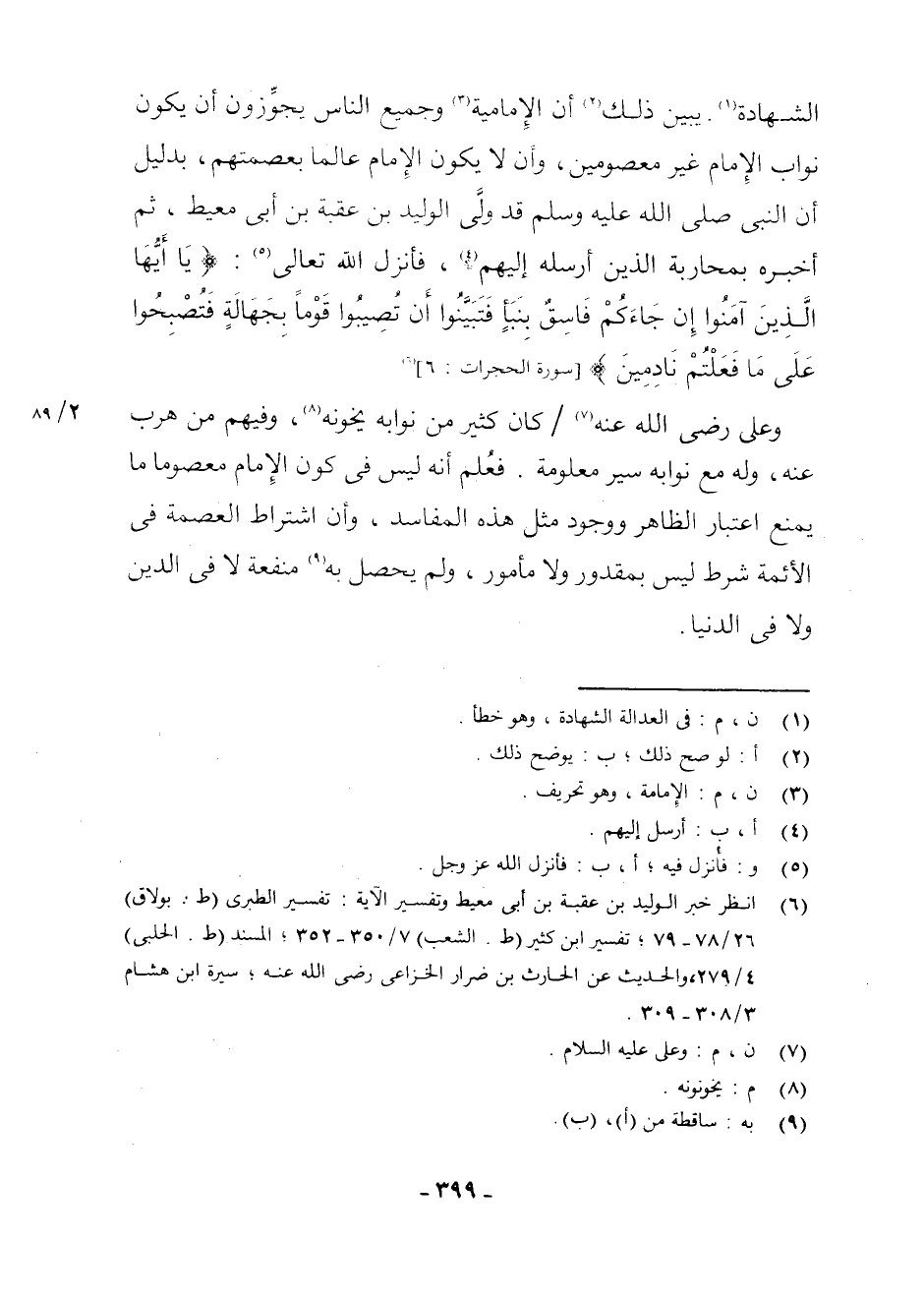 الشَّهَادَةِ (¬1) يُبَيِّنُ ذَلِكَ (¬2) أَنَّ الْإِمَامِيَّةَ (¬3) وَجَمِيعُ النَّاسِ يُجَوِّزُونَ أَنْ يَكُونَ نُوَّابَ الْإِمَامِ غَيْرَ مَعْصُومِينَ، وَأَنْ لَا يَكُونَ الْإِمَامُ عَالِمًا بِعِصْمَتِهِمْ، بِدَلِيلِ أَنَّ النَّبِيَّ - صَلَّى اللَّهُ عَلَيْهِ وَسَلَّمَ - قَدْ وَلَّى الْوَلِيدَ بْنَ عُقْبَةَ بْنِ أَبِي مُعَيْطٍ ثُمَّ أَخْبَرَهُ بِمُحَارَبَةِ الَّذِينَ أَرْسَلَهُ إِلَيْهِمْ (¬4) فَأَنْزَلَ اللَّهُ تَعَالَى (¬5) {يَاأَيُّهَا الَّذِينَ آمَنُوا إِنْ جَاءَكُمْ فَاسِقٌ بِنَبَإٍ فَتَبَيَّنُوا أَنْ تُصِيبُوا قَوْمًا بِجَهَالَةٍ فَتُصْبِحُوا عَلَى مَا فَعَلْتُمْ نَادِمِينَ} [سُورَةُ الْحُجُرَاتِ: 6] (¬6) وَعَلِيٌّ - رَضِيَ اللَّهُ عَنْهُ - (¬7) كَانَ كَثِيرٌ مِنْ نُوَّابِهِ يَخُونُهُ (¬8) ، وَفِيهِمْ مَنْ هَرَبَ عَنْهُ، وَلَهُ مَعَ نُوَّابِهِ سِيَرٌ مَعْلُومَةٌ. فَعُلِمَ أَنَّهُ لَيْسَ فِي كَوْنِ الْإِمَامِ مَعْصُومًا مَا يَمْنَعُ اعْتِبَارَ الظَّاهِرِ وَوُجُودَ مِثْلِ هَذِهِ الْمَفَاسِدِ، وَأَنَّ اشْتِرَاطَ الْعِصْمَةِ فِي الْأَئِمَّةِ شَرْطٌ لَيْسَ بِمَقْدُورٍ وَلَا مَأْمُورٍ، وَلَمْ يَحْصُلْ بِهِ (¬9) مَنْفَعَةٌ، لَا فِي الدِّينِ وَلَا فِي الدُّنْيَا.