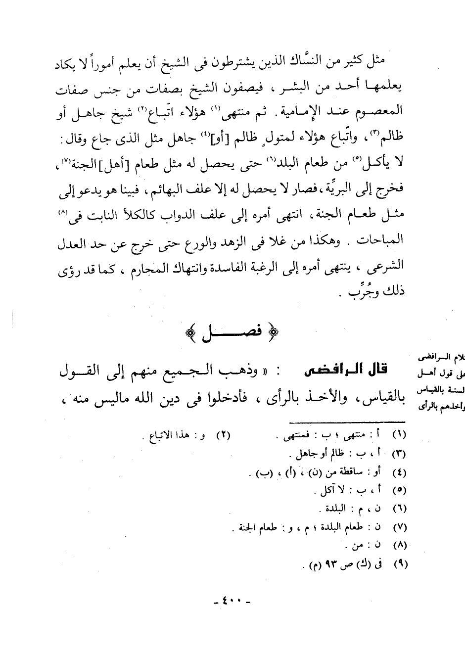 مِثْلُ كَثِيرٍ مِنَ النُّسَّاكِ الَّذِينَ يَشْتَرِطُونَ فِي الشَّيْخِ أَنْ يَعْلَمَ أُمُورًا لَا يَكَادُ يَعْلَمُهَا أَحَدٌ مِنَ الْبَشَرِ، فَيَصِفُونَ الشَّيْخَ بِصِفَاتٍ مِنْ جِنْسِ صِفَاتِ الْمَعْصُومِ عِنْدَ الْإِمَامِيَّةِ. ثُمَّ مُنْتَهَى (¬1) هَؤُلَاءِ اتِّبَاعُ (¬2) شَيْخٍ جَاهِلٍ أَوْ ظَالِمٍ (¬3) ، وَاتِّبَاعُ هَؤُلَاءِ لِمُتَوَلٍّ ظَالِمٍ أَوْ (¬4) جَاهِلٍ مِثْلِ الَّذِي جَاعَ وَقَالَ: لَا يَأْكُلُ (¬5) مِنْ طَعَامِ الْبَلَدِ (¬6) حَتَّى يَحْصُلَ لَهُ مِثْلُ طَعَامِ أَهْلِ الْجَنَّةِ (¬7) ، فَخَرَجَ إِلَى الْبَرِّيَّةِ فَصَارَ لَا يَحْصُلُ لَهُ إِلَّا عَلَفُ الْبَهَائِمِ، فَبَيْنَا هُوَ يَدْعُو إِلَى مَثَلِ طَعَامِ الْجَنَّةِ، انْتَهَى أَمْرُهُ إِلَى عَلَفِ الدَّوَابِّ كَالْكَلَأِ النَّابِتِ فِي (¬8) الْمُبَاحَاتِ. وَهَكَذَا مَنْ غَلَا فِي الزُّهْدِ وَالْوَرَعِ حَتَّى خَرَجَ عَنْ حَدِّ الْعَدْلِ الشَّرْعِيِّ، يَنْتَهِي أَمْرُهُ إِلَى الرَّغْبَةِ الْفَاسِدَةِ وَانْتِهَاكِ الْمَحَارِمِ، كَمَا قَدْ رُؤِيَ ذَلِكَ وَجُرِّبَ.