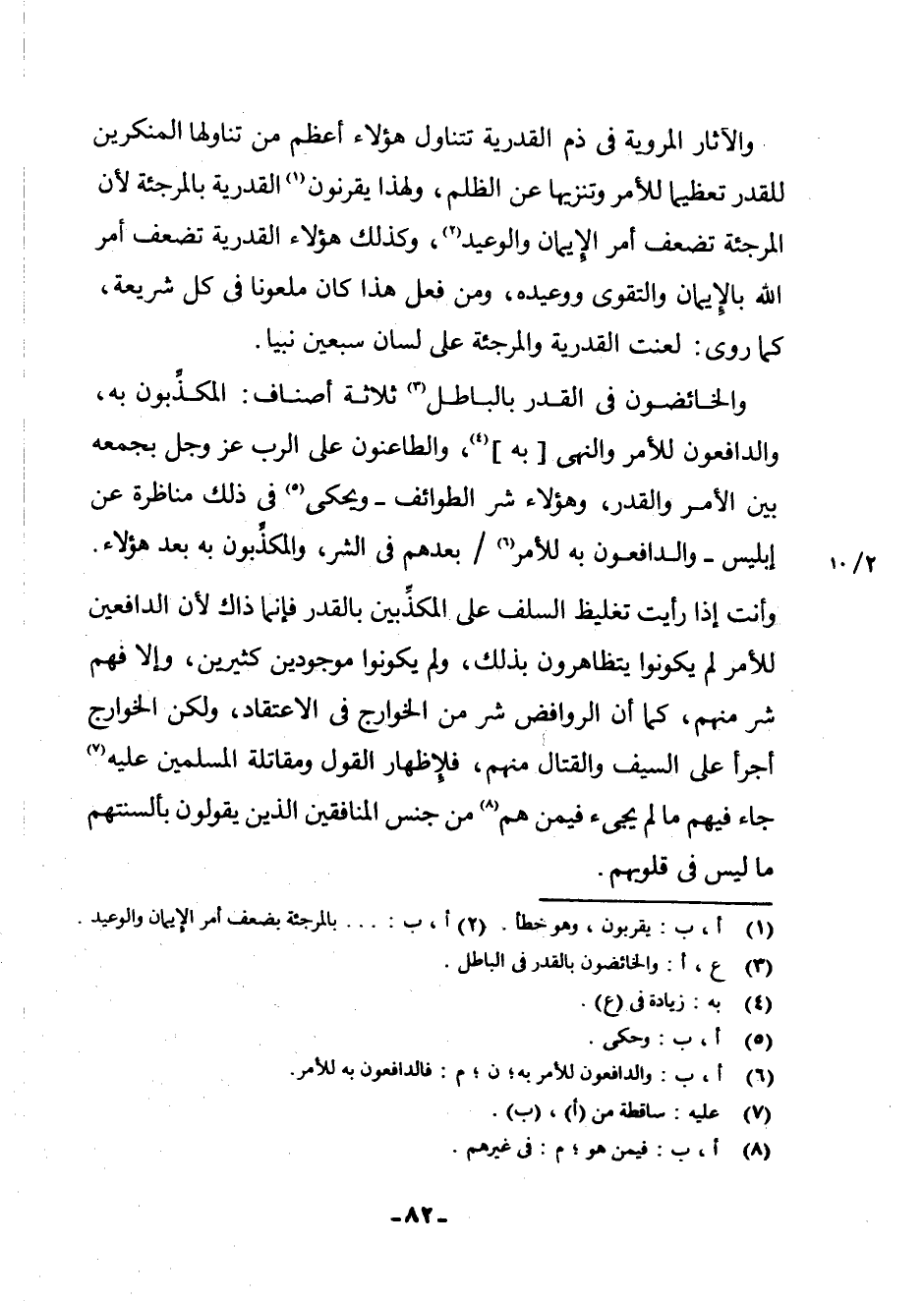 وَأَنْتَ إِذَا رَأَيْتَ تَغْلِيظَ السَّلَفِ عَلَى الْمُكَذِّبِينَ بِالْقَدَرِ فَإِنَّمَا ذَاكَ لِأَنَّ الدَّافِعِينَ لِلْأَمْرِ لَمْ يَكُونُوا يَتَظَاهَرُونَ بِذَلِكَ، وَلَمْ يَكُونُوا مَوْجُودِينَ كَثِيرِينَ، وَإِلَّا فَهُمْ شَرٌّ مِنْهُمْ، كَمَا أَنَّ الرَّوَافِضَ شَرٌّ مِنَ الْخَوَارِجِ فِي الِاعْتِقَادِ، وَلَكِنَّ الْخَوَارِجَ أَجْرَأُ عَلَى السَّيْفِ وَالْقِتَالِ مِنْهُمْ، فَلِإِظْهَارِ الْقَوْلِ وَمُقَاتَلَةِ الْمُسْلِمِينَ عَلَيْهِ (¬7) جَاءَ فِيهِمْ مَا لَا يَجِيءُ فِيمَنْ هُمْ (¬8) مِنْ جِنْسِ الْمُنَافِقِينَ الَّذِينَ يَقُولُونَ بِأَلْسِنَتِهِمْ مَا لَيْسَ فِي قُلُوبِهِمْ.
