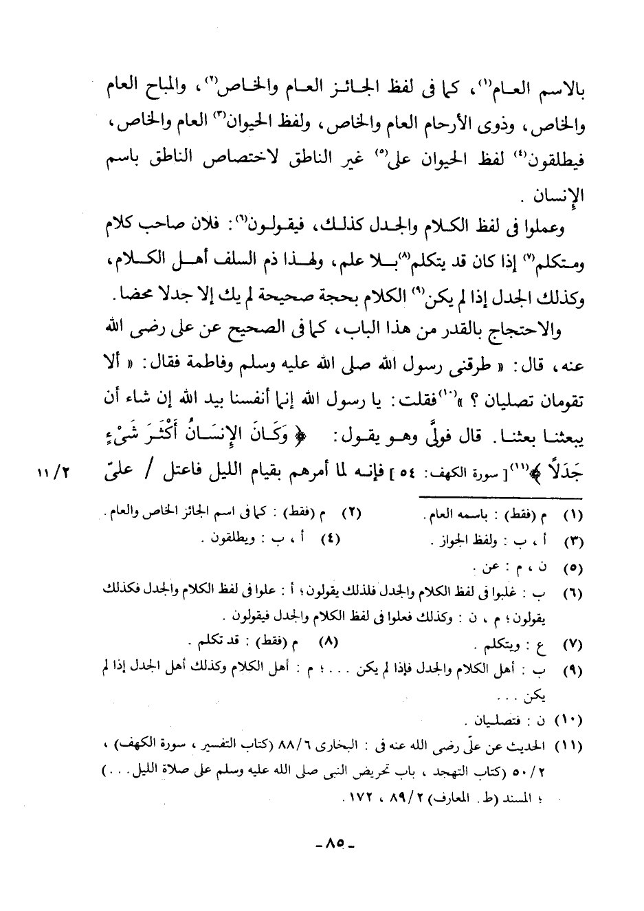 (¬11) الْحَدِيثُ عَنْ عَلِيٍّ رَضِيَ اللَّهُ عَنْهُ فِي: الْبُخَارِيِّ 6/88 (كِتَابُ التَّفْسِيرِ، سُورَةُ الْكَهْفِ، 2/50 (كِتَابُ التَّهَجُّدِ، بَابُ تَحْرِيضِ النَّبِيِّ صَلَّى اللَّهُ عَلَيْهِ وَسَلَّمَ عَلَى صَلَاةِ اللَّيْلِ. . .) ، الْمُسْنَدَ (ط الْمَعَارِفِ) 2/89، 172.