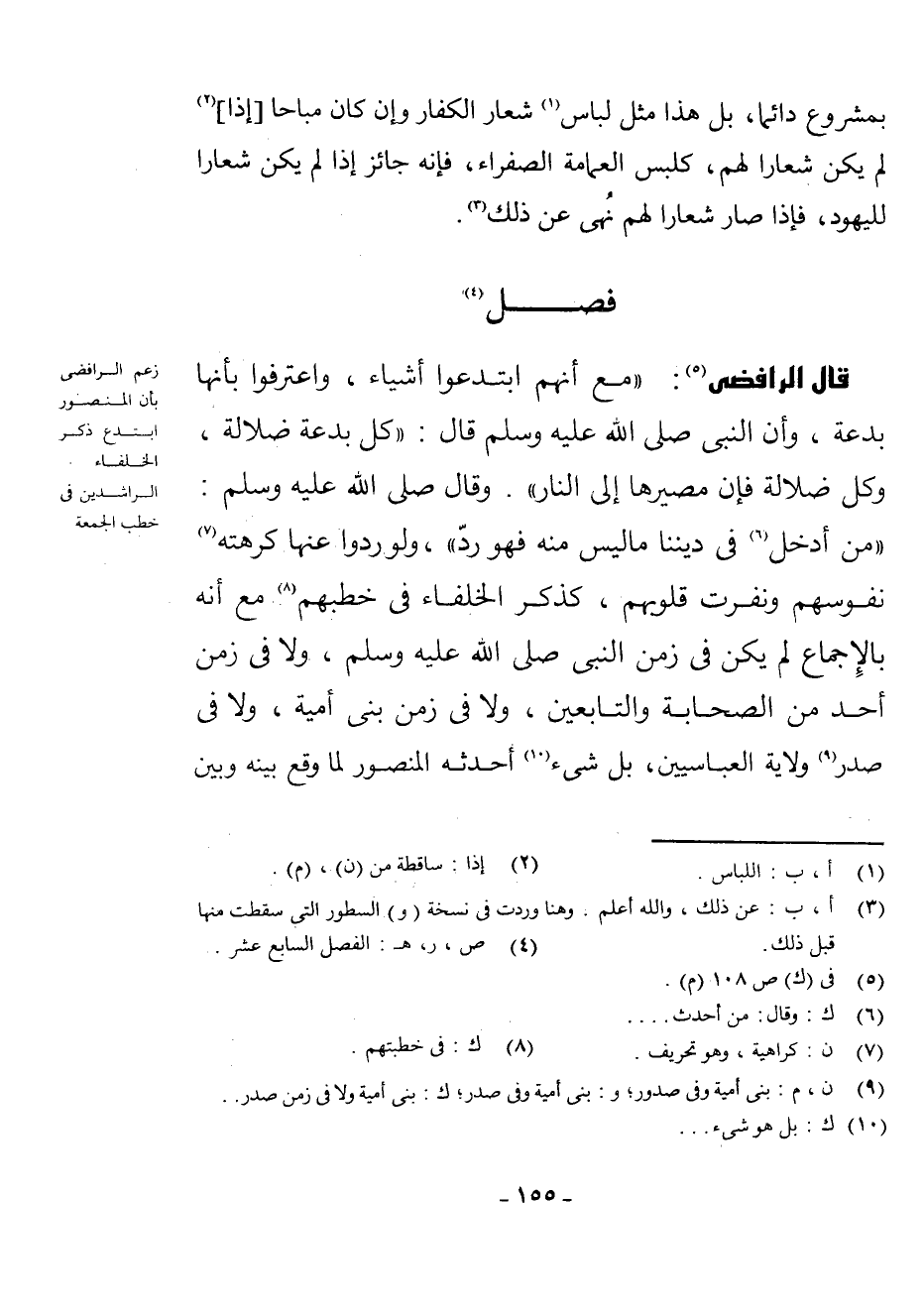 قَالَ الرَّافِضِيُّ (¬5) : " مَعَ أَنَّهُمُ ابْتَدَعُوا أَشْيَاءَ، وَاعْتَرَفُوا بِأَنَّهَا بِدْعَةٌ، وَأَنَّ النَّبِيَّ - صَلَّى اللَّهُ عَلَيْهِ وَسَلَّمَ - قَالَ: " «كُلُّ بِدْعَةٍ ضَلَالَةٌ، وَكُلُّ ضَلَالَةٍ فَإِنَّ مَصِيرَهَا إِلَى النَّارِ» ". وَقَالَ - صَلَّى اللَّهُ عَلَيْهِ وَسَلَّمَ -: " «مَنْ أَدْخَلَ (¬6) فِي دِينِنَا مَا لَيْسَ مِنْهُ فَهُوَ رَدٌّ» "، وَلَوْ رُدُّوا عَنْهَا كَرِهَتْهُ (¬7) نُفُوسُهُمْ وَنَفَرَتْ قُلُوبُهُمْ، كَذِكْرِ الْخُلَفَاءِ فِي خُطَبِهِمْ (¬8) مَعَ أَنَّهُ بِالْإِجْمَاعِ لَمْ يَكُنْ فِي زَمَنِ النَّبِيِّ - صَلَّى اللَّهُ عَلَيْهِ وَسَلَّمَ -، وَلَا فِي زَمَنِ أَحَدٍ مِنَ الصَّحَابَةِ وَالتَّابِعِينَ، وَلَا فِي زَمَنِ بَنِي أُمَيَّةَ، وَلَا فِي صَدْرِ (¬9) وِلَايَةِ الْعَبَّاسِيِّينَ، بَلْ شَيْءٌ (¬10) أَحْدَثَهُ الْمَنْصُورُ لِمَا وَقَعَ بَيْنَهُ وَبَيْنَ