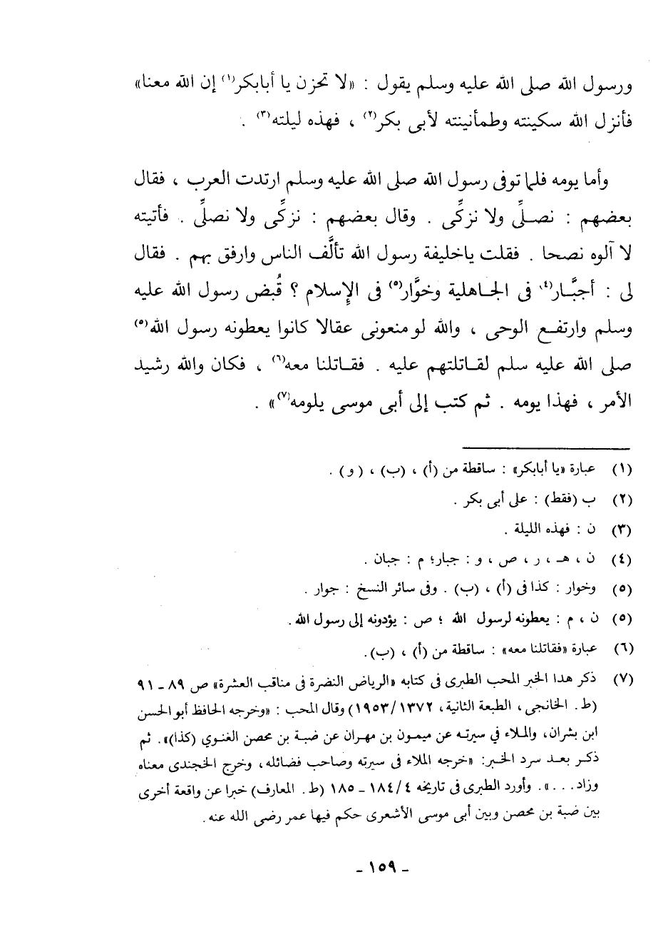 (¬8) ذَكَرَ هَذَا الْخَبَرَ الْمُحِبُّ الطَّبَرِيُّ فِي كِتَابِهِ " الرِّيَاضِ النَّضِرَةِ فِي مَنَاقِبِ الْعَشَرَةِ " ص 89، 91 (ط. الْخَانَجِيِّ، الطَّبْعَةَ الثَّانِيَةَ، 1372 1953) وَقَالَ الْمُحِبُّ: " وَخَرَّجَهُ الْحَافِظُ أَبُو الْحَسَنِ بْنُ بِشْرَانَ وَالْمُلَّاءُ فِي سِيرَتِهِ عَنْ مَيْمُونِ بْنِ مِهْرَانَ عَنْ ضَبَّةَ بْنِ مِحْصَنٍ الْغَنَوِيِّ (كَذَا) ". ثُمَّ ذَكَرَ بَعْدَ سَرْدِ الْخَبَرِ: " خَرَّجَهُ الْمُلَّاءُ فِي سِيرَتِهِ وَصَاحِبِ فَضَائِلِهِ، وَخَرَّجَ الْخُجَنْدِيُّ مَعْنَاهُ وَزَادَ. . . ". وَأَوْرَدَ الطَّبَرِيُّ فِي تَارِيخِهِ 4/184 185 (ط. الْمَعَارِفِ) . خَبَرًا عَنْ وَاقِعَةٍ أُخْرَى بَيْنَ ضَبَّةَ بْنِ مِحْصَنٍ وَبَيْنَ أَبِي مُوسَى الْأَشْعَرِيِّ حَكَمَ فِيهَا عُمَرُ - رَضِيَ اللَّهُ عَنْهُ -.