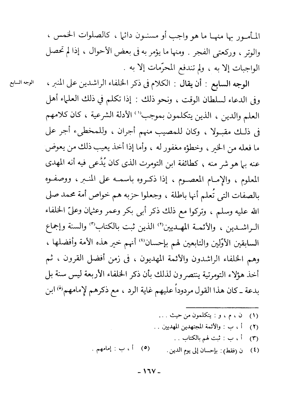 الْوَجْهُ السَّابِعُ: أَنْ يُقَالَ: الْكَلَامُ فِي ذِكْرِ الْخُلَفَاءِ الرَّاشِدِينَ عَلَى الْمِنْبَرِ، وَفِي الدُّعَاءِ لِسُلْطَانِ الْوَقْتِ، وَنَحْوِ ذَلِكَ: إِذَا تَكَلَّمَ فِي ذَلِكَ الْعُلَمَاءُ أَهْلُ الْعِلْمِ وَالدِّينِ، الَّذِينَ يَتَكَلَّمُونَ بِمُوجَبِ (¬1) الْأَدِلَّةِ الشَّرْعِيَّةِ، كَانَ كَلَامُهُمْ فِي ذَلِكَ مَقْبُولًا، وَكَانَ لِلْمُصِيبِ مِنْهُمْ أَجْرَانِ، وَلِلْمُخْطِئِ أَجْرٌ عَلَى مَا فَعَلَهُ مِنَ الْخَيْرِ، وَخَطَؤُهُ مَغْفُورٌ لَهُ، وَأَمَّا إِذَا أَخَذَ يَعِيبُ ذَلِكَ مَنْ يُعَوِّضُ عَنْهُ بِمَا هُوَ شَرٌّ مِنْهُ، كَطَائِفَةِ ابْنِ التُّومَرْتِ الَّذِي كَانَ يُدَّعَى فِيهِ أَنَّهُ الْمَهْدِيُّ الْمَعْلُومُ، وَالْإِمَامُ الْمَعْصُومُ، إِذَا ذَكَرُوهُ بِاسْمِهِ عَلَى الْمِنْبَرِ، وَوَصَفُوهُ بِالصِّفَاتِ الَّتِي تُعَلَمُ أَنَّهَا بَاطِلَةٌ، وَجَعَلُوا حِزْبَهُ هُمْ خَوَاصُّ أُمَّةِ مُحَمَّدٍ - صَلَّى اللَّهُ عَلَيْهِ وَسَلَّمَ -، وَتَرَكُوا مَعَ ذَلِكَ ذِكْرَ أَبِي بَكْرٍ وَعُمَرَ وَعُثْمَانَ وَعَلِيٍّ الْخُلَفَاءِ الرَّاشِدِينَ، وَالْأَئِمَّةِ الْمَهْدِيِّينَ (¬2) الَّذِينَ ثَبَتَ بِالْكِتَابِ (¬3) وَالسُّنَّةِ وَإِجْمَاعِ السَّابِقِينَ الْأَوَّلِينَ وَالتَّابِعِينَ لَهُمْ بِإِحْسَانٍ (¬4) أَنَّهُمْ خَيْرُ هَذِهِ الْأُمَّةِ وَأَفْضَلُهَا، وَهُمُ الْخُلَفَاءُ الرَّاشِدُونَ وَالْأَئِمَّةُ الْمَهْدِيُّونَ فِي زَمَنِ أَفْضَلِ الْقُرُونِ، ثُمَّ أَخَذَ هَؤُلَاءِ التُّومَرْتِيَّةُ يَنْتَصِرُونَ لِذَلِكَ بِأَنَّ ذِكْرَ الْخُلَفَاءِ الْأَرْبَعَةِ لَيْسَ سُنَّةً بَلْ بِدْعَةً - كَانَ هَذَا الْقَوْلُ مَرْدُودًا عَلَيْهِمْ غَايَةَ الرَّدِّ مَعَ ذِكْرِهِمْ لِإِمَامِهِمْ (¬5) ابْنِ