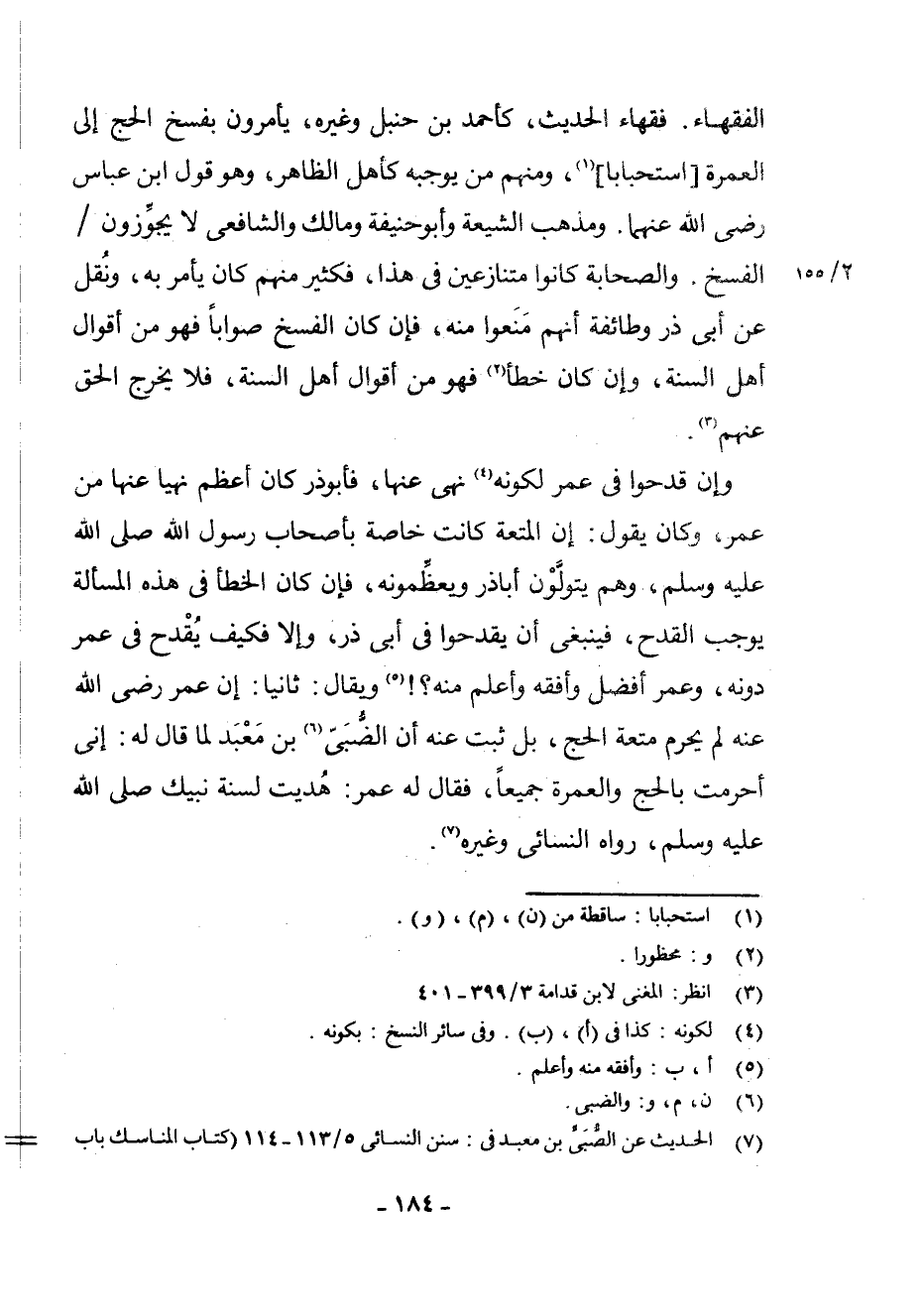 الْفُقَهَاءِ. فُقَهَاءُ الْحَدِيثِ، كَأَحْمَدَ بْنِ حَنْبَلٍ وَغَيْرِهِ، يَأْمُرُونَ بِفَسْخِ الْحَجِّ إِلَى الْعُمْرَةِ [اسْتِحْبَابًا] (¬1) وَمِنْهُمْ مَنْ يُوجِبُهُ كَأَهْلِ الظَّاهِرِ، وَهُوَ قَوْلُ ابْنِ عَبَّاسٍ - رَضِيَ اللَّهُ عَنْهُمَا -. وَمَذْهَبُ الشِّيعَةِ وَأَبُو حَنِيفَةَ وَمَالِكٌ وَالشَّافِعِيُّ لَا يُجَوِّزُونَ الْفَسْخَ. وَالصَّحَابَةُ كَانُوا مُتَنَازِعِينَ فِي هَذَا، فَكَثِيرٌ مِنْهُمْ كَانَ يَأْمُرُ بِهِ، وَنُقِلَ عَنْ أَبِي ذَرٍّ وَطَائِفَةٍ أَنَّهُمْ مَنَعُوا مِنْهُ، فَإِنْ كَانَ الْفَسْخُ صَوَابًا فَهُوَ مِنْ أَقْوَالِ أَهْلِ السُّنَّةِ، وَإِنْ كَانَ خَطَأً (¬2) فَهُوَ مِنْ أَقْوَالِ أَهْلِ السُّنَّةِ، فَلَا يَخْرُجُ الْحَقُّ عَنْهُمْ (¬3) .