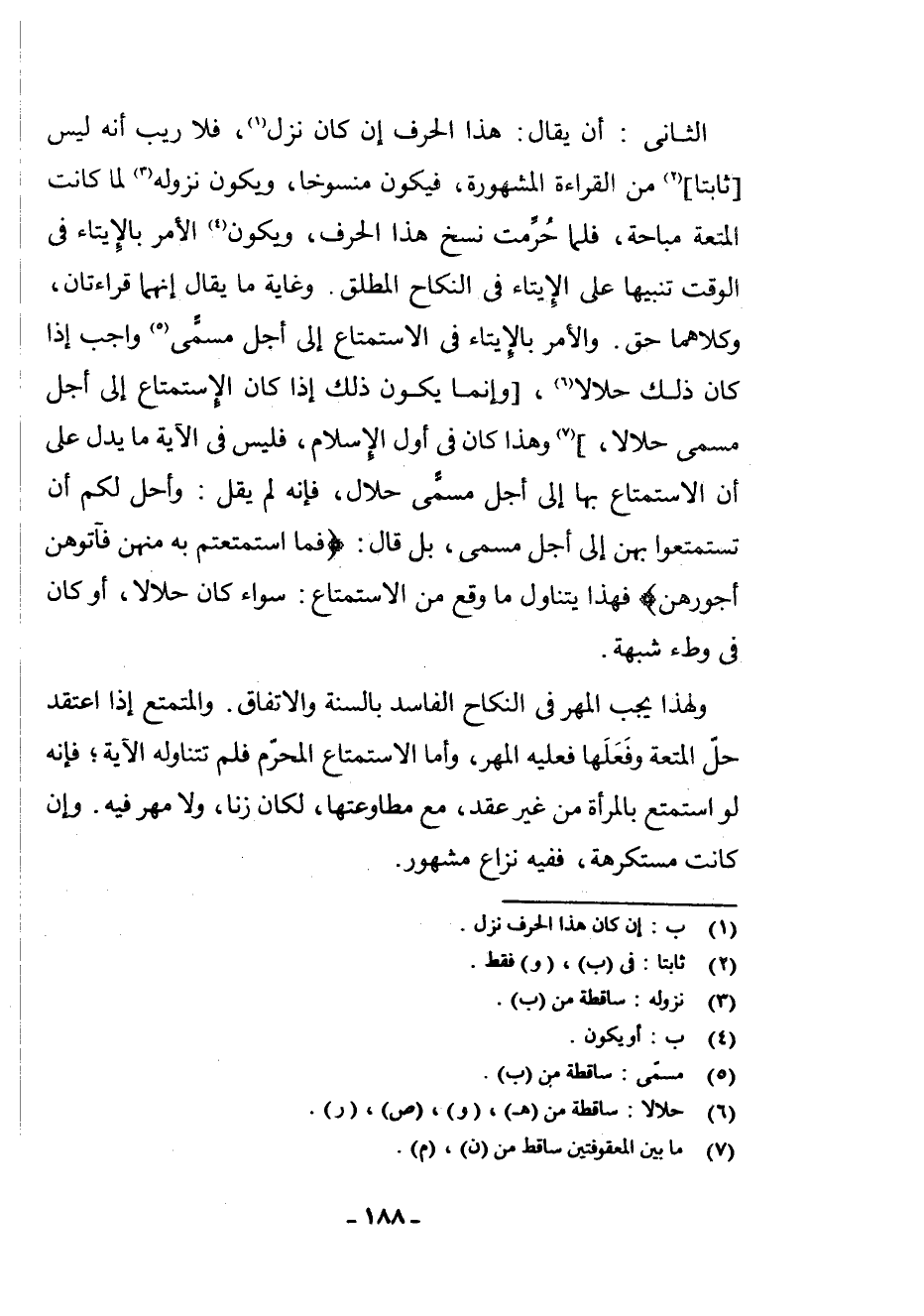 الثَّانِي: أَنْ يُقَالَ: هَذَا الْحَرْفُ إِنْ كَانَ نَزَلَ (¬1) ، فَلَا رَيْبَ أَنَّهُ لَيْسَ [ثَابِتًا] (¬2) مِنَ الْقِرَاءَةِ الْمَشْهُورَةِ، فَيَكُونُ مَنْسُوخًا، وَيَكُونُ نُزُولُهُ (¬3) لَمَّا كَانَتِ الْمُتْعَةُ مُبَاحَةً، فَلَمَّا حُرِّمَتْ نُسِخَ هَذَا الْحَرْفُ، وَيَكُونُ (¬4) الْأَمْرُ بِالْإِيتَاءِ فِي الْوَقْتِ تَنْبِيهًا عَلَى الْإِيتَاءِ فِي النِّكَاحِ الْمُطْلَقِ. وَغَايَةُ مَا يُقَالُ: إِنَّهُمَا قِرَاءَتَانِ، وَكِلَاهُمَا حَقٌّ. وَالْأَمْرُ بِالْإِيتَاءِ فِي الِاسْتِمْتَاعِ إِلَى أَجَلٍ مُسَمًّى (¬5) وَاجِبٌ إِذَا كَانَ ذَلِكَ حَلَالًا (¬6) ، [وَإِنَّمَا يَكُونُ ذَلِكَ إِذَا كَانَ الِاسْتِمْتَاعُ إِلَى أَجَلٍ مُسَمًّى حَلَالًا،] (¬7) وَهَذَا كَانَ فِي أَوَّلِ الْإِسْلَامِ، فَلَيْسَ فِي الْآيَةِ مَا يَدُلُّ عَلَى أَنَّ الِاسْتِمْتَاعَ بِهَا إِلَى أَجَلٍ مُسَمًّى حَلَالٌ، فَإِنَّهُ لَمْ يَقُلْ: وَأُحِلَّ لَكُمْ أَنْ تَسْتَمْتِعُوا بِهِنَّ إِلَى أَجَلٍ مُسَمًّى، بَلْ قَالَ: (فَمَا اسْتَمْتَعْتُمْ بِهِ مِنْهُنَّ فَآتُوهُنَّ أُجُورَهُنَّ) فَهَذَا يَتَنَاوَلُ مَا وَقَعَ مِنَ الِاسْتِمْتَاعِ: سَوَاءٌ كَانَ حَلَالًا، أَوْ كَانَ فِي وَطْءِ شُبْهَةٍ.