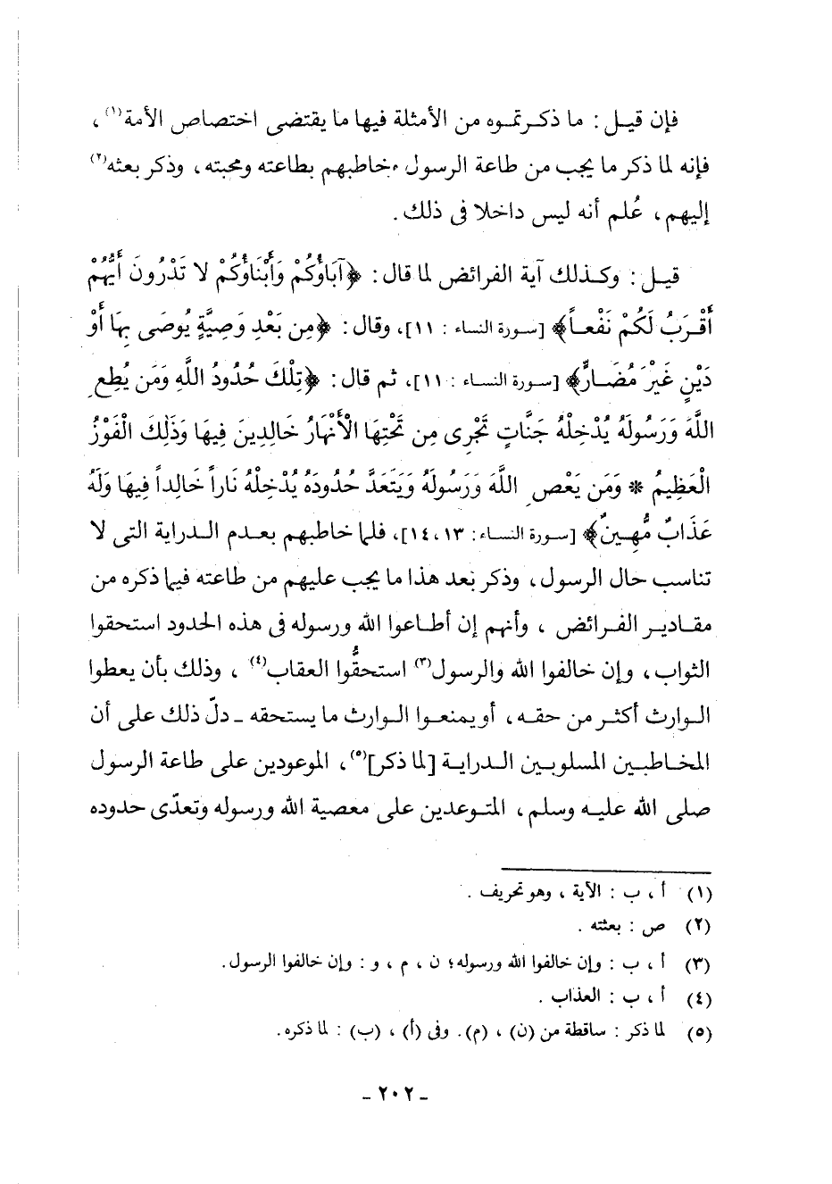 قِيلَ: وَكَذَلِكَ آيَةُ الْفَرَائِضِ لَمَّا قَالَ: {آبَاؤُكُمْ وَأَبْنَاؤُكُمْ لَا تَدْرُونَ أَيُّهُمْ أَقْرَبُ لَكُمْ نَفْعًا} [سُورَةِ النِّسَاءِ: 11] ، وَقَالَ: {مِنْ بَعْدِ وَصِيَّةٍ يُوصَى بِهَا أَوْ دَيْنٍ غَيْرَ مُضَارٍّ} [سُورَةِ النِّسَاءِ: 11] ، ثُمَّ قَالَ: {تِلْكَ حُدُودُ اللَّهِ وَمَنْ يُطِعِ اللَّهَ وَرَسُولَهُ يُدْخِلْهُ جَنَّاتٍ تَجْرِي مِنْ تَحْتِهَا الْأَنْهَارُ خَالِدِينَ فِيهَا وَذَلِكَ الْفَوْزُ الْعَظِيمُ - وَمَنْ يَعْصِ اللَّهَ وَرَسُولَهُ وَيَتَعَدَّ حُدُودَهُ يُدْخِلْهُ نَارًا خَالِدًا فِيهَا وَلَهُ عَذَابٌ مُهِينٌ} " [سُورَةِ النِّسَاءِ: 13، 14] ، فَلَمَّا خَاطَبَهُمْ بِعَدَمِ الدِّرَايَةِ الَّتِي لَا تُنَاسِبُ حَالَ الرَّسُولِ، وَذَكَرَ بَعْدَ هَذَا مَا يَجِبُ عَلَيْهِمْ مِنْ طَاعَتِهِ فِيمَا ذَكَرَهُ مِنْ مَقَادِيرِ الْفَرَائِضِ، وَأَنَّهُمْ إِنْ أَطَاعُوا اللَّهَ وَرَسُولَهُ فِي هَذِهِ الْحُدُودِ اسْتَحَقُّوا الثَّوَابَ، وَإِنْ خَالَفُوا اللَّهَ وَالرَّسُولَ (¬3) اسْتَحَقُّوا الْعِقَابَ (¬4) ، وَذَلِكَ بِأَنْ يُعْطُوا الْوَارِثَ أَكْثَرَ مِنْ حَقِّهِ، أَوْ يَمْنَعُوا الْوَارِثَ مَا يَسْتَحِقُّهُ - دَلَّ ذَلِكَ عَلَى أَنَّ الْمُخَاطَبِينَ الْمَسْلُوبِينَ الدِّرَايَةَ [لَمَّا ذَكَرَ] (¬5) ، الْمَوْعُودِينَ عَلَى طَاعَةِ الرَّسُولِ - صَلَّى اللَّهُ عَلَيْهِ وَسَلَّمَ -، الْمُتَوَعِّدِينَ عَلَى مَعْصِيَةِ اللَّهِ وَرَسُولِهِ وَتَعَدِّي حُدُودِهِ