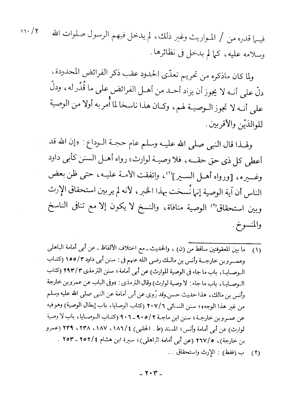 (¬1) مَا بَيْنَ الْمَعْقُوفَتَيْنِ سَاقِطٌ مِنْ (ن) ، وَالْحَدِيثُ - مَعَ اخْتِلَافِ الْأَلْفَاظِ - عَنْ أَبِي أُمَامَةَ الْبَاهِلِيِّ وَعَمْرِو بْنِ خَارِجَةَ وَأَنَسِ بْنِ مَالِكٍ - رَضِيَ اللَّهُ عَنْهُمْ - فِي: سُنَنِ أَبِي دَاوُدَ 3/155 (كِتَابُ الْوَصَايَا، بَابُ مَا جَاءَ فِي الْوَصِيَّةِ لِلْوَارِثِ) عَنْ أَبِي أُمَامَةَ؛ سُنَنِ التِّرْمِذِيِّ 3/293 (كِتَابُ الْوَصَايَا، بَابُ مَا جَاءَ: لَا وَصِيَّةَ لِوَارِثٍ) وَقَالَ التِّرْمِذِيُّ: " وَفِي الْبَابِ عَنْ عَمْرِو بْنِ خَارِجَةَ وَأَنَسِ بْنِ مَالِكٍ، هَذَا حَدِيثٌ حَسَنٌ. وَقَدْ رُوِيَ عَنْ أَبِي أُمَامَةَ عَنِ النَّبِيِّ صَلَّى اللَّهُ عَلَيْهِ وَسَلَّمَ مِنْ غَيْرِ هَذَا الْوَجْهِ "؛ سُنَنِ النَّسَائِيِّ 6/207 (كِتَابُ الْوَصَايَا، بَابُ إِبْطَالِ الْوَصِيَّةِ) وَهُوَ فِيهِ عَنْ عَمْرِو بْنِ خَارِجَةَ؛ سُنَنِ ابْنِ مَاجَهْ 2/905 - 906 (كِتَابُ الْوَصَايَا، بَابُ لَا وَصِيَّةَ لِوَارِثٍ) عَنْ أَبِي أُمَامَةَ وَأَنَسِ؛ الْمُسْنَدِ (ط. الْحَلَبِيِّ) 4/186 - 187 - 238 - 239 (عَمْرِو بْنِ خَارِجَةَ) ، 5/267 (عَنْ أَبِي أُمَامَةَ الْبَاهِلِيِّ) ؛ سِيرَةِ ابْنِ هِشَامٍ 4/252 - 253.