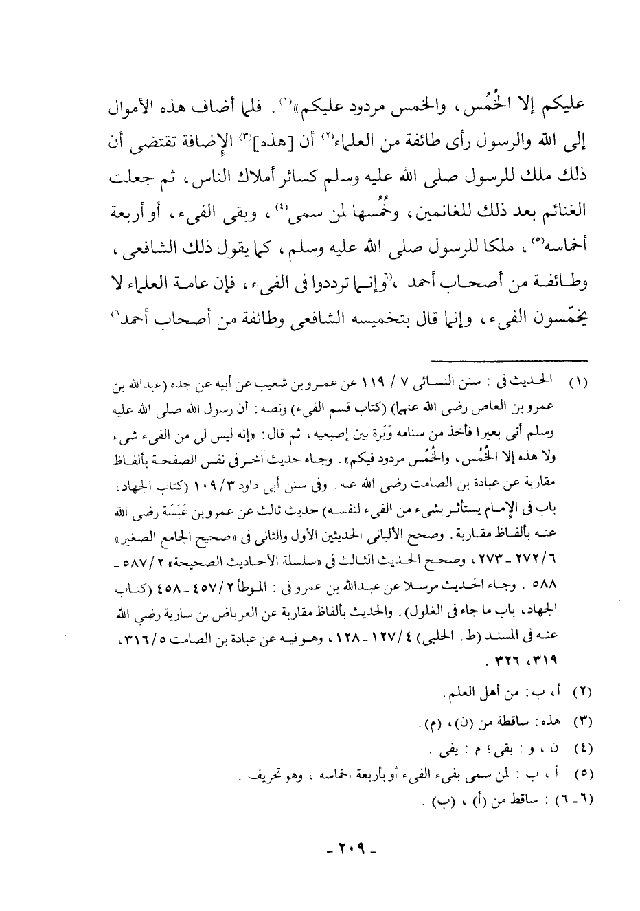 (¬1) الْحَدِيثُ فِي: سُنَنِ النَّسَائِيِّ 7/119 عَنْ عَمْرِو بْنِ شُعَيْبٍ عَنْ أَبِيهِ عَنْ جَدِّهِ (عَبْدِ اللَّهِ بْنِ عَمْرِو بْنِ الْعَاصِ - رَضِيَ اللَّهُ عَنْهُمَا -) (كِتَابُ قَسْمِ الْفَيْءِ) وَنَصُّهُ: أَنَّ رَسُولَ اللَّهِ - صَلَّى اللَّهُ عَلَيْهِ وَسَلَّمَ - أَتَى بَعِيرًا فَأَخَذَ مِنْ سَنَامِهِ وَبَرَةً بَيْنَ إِصْبَعَيْهِ، ثُمَّ قَالَ: " إِنَّهُ لَيْسَ لِي مِنَ الْفَيْءِ شَيْءٌ وَلَا هَذِهِ إِلَّا الْخُمُسُ، وَالْخُمُسُ مَرْدُودٌ فِيكُمْ ". وَجَاءَ حَدِيثٌ آخَرُ فِي نَفْسِ الصَّفْحَةِ بِأَلْفَاظٍ مُقَارِبَةٍ عَنْ عُبَادَةَ بْنِ الصَّامِتِ - رَضِيَ اللَّهُ عَنْهُ -. وَفِي سُنَنِ أَبِي دَاوُدَ 3/109 (كِتَابُ الْجِهَادِ، بَابٌ فِي الْإِمَامِ يَسْتَأْثِرُ بِشَيْءٍ مِنَ الْفَيْءِ لِنَفْسِهِ) حَدِيثٌ ثَالِثٌ عَنْ عَمْرِو بْنِ عَبَسَةَ - رَضِيَ اللَّهُ عَنْهُ - بِأَلْفَاظٍ مُقَارِبَةٍ. وَصَحَّحَ الْأَلْبَانِيُّ الْحَدِيثَيْنِ الْأَوَّلَ وَالثَّانِيَ فِي " صَحِيحِ الْجَامِعِ الصَّغِيرِ " 6/272 - 273، وَصَحَّحَ الْحَدِيثَ الثَّالِثَ فِي " سِلْسِلَةِ الْأَحَادِيثِ الصَّحِيحَةِ " 2/587 - 588. وَجَاءَ الْحَدِيثُ مُرْسَلًا عَنْ عَبْدِ اللَّهِ بْنِ عَمْرٍو فِي: الْمُوَطَّأِ 2/457 - 458 (كِتَابُ الْجِهَادِ، بَابُ مَا جَاءَ فِي الْغُلُولِ) . وَالْحَدِيثُ بِأَلْفَاظٍ مُقَارِبَةٍ عَنِ الْعِرْبَاضِ بْنِ سَارِيَةَ - رَضِيَ اللَّهُ عَنْهُ - فِي الْمُسْنَدِ (ط. الْحَلَبِيِّ) 4/127 - 128، وَهُوَ فِيهِ عَنْ عُبَادَةَ بْنِ الصَّامِتِ 5/316 - 319 - 326.