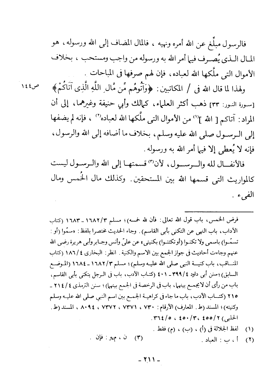 فَالرَّسُولُ مُبَلِّغٌ عَنِ اللَّهِ أَمْرَهُ وَنَهْيَهُ، فَالْمَالُ الْمُضَافُ إِلَى اللَّهِ وَرَسُولِهِ، هُوَ الْمَالُ الَّذِي يُصْرَفُ فِيمَا أَمَرَ اللَّهُ بِهِ وَرَسُولُهُ مِنْ وَاجِبٍ وَمُسْتَحَبٍّ، بِخِلَافِ الْأَمْوَالِ الَّتِي مَلَكَهَا اللَّهُ لِعِبَادِهِ، فَإِنَّ لَهُمْ صَرْفَهَا فِي الْمُبَاحَاتِ.