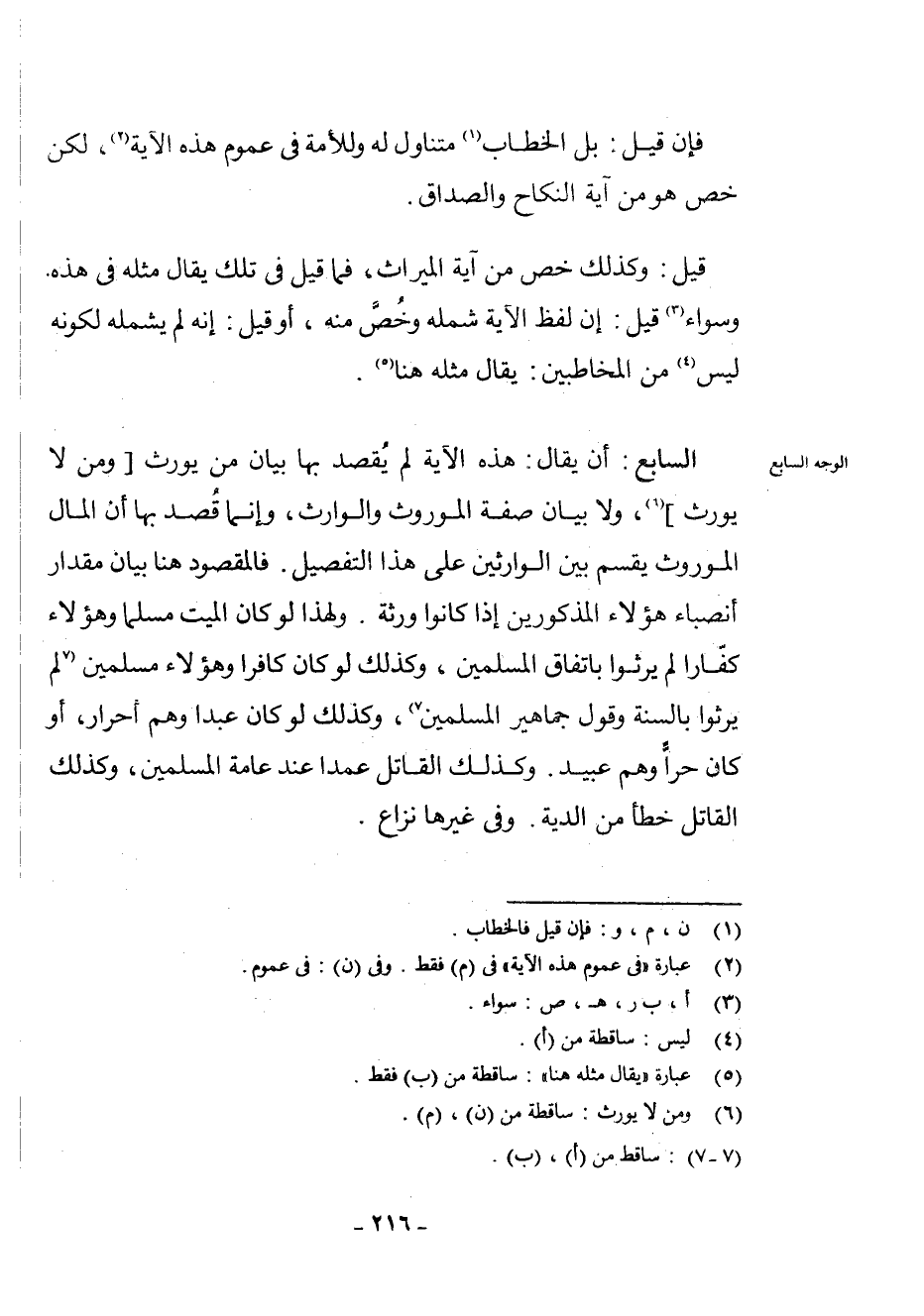 السَّابِعُ: أَنْ يُقَالَ: هَذِهِ الْآيَةُ لَمْ يُقْصَدْ بِهَا بَيَانُ مَنْ يُورَثُ [وَمَنْ لَا يُورَثُ] (¬6) ، وَلَا بَيَانُ صِفَةِ الْمَوْرُوثِ وَالْوَارِثِ، وَإِنَّمَا قُصِدَ بِهَا أَنَّ الْمَالَ الْمَوْرُوثَ يُقَسَّمُ بَيْنَ الْوَارِثِينَ عَلَى هَذَا التَّفْصِيلِ. فَالْمَقْصُودُ هُنَا بَيَانُ مِقْدَارِ أَنْصِبَاءِ هَؤُلَاءِ الْمَذْكُورِينَ إِذَا كَانُوا وَرَثَةً. وَلِهَذَا لَوْ كَانَ الْمَيِّتُ مُسْلِمًا وَهَؤُلَاءِ كُفَّارًا لَمْ يَرِثُوا بِاتِّفَاقِ الْمُسْلِمِينَ، وَكَذَلِكَ لَوْ كَانَ كَافِرًا وَهَؤُلَاءِ مُسْلِمِينَ لَمْ يَرِثُوا بِالسُّنَّةِ وَقَوْلِ جَمَاهِيرِ الْمُسْلِمِينَ (¬7) ، وَكَذَلِكَ لَوْ كَانَ عَبْدًا وَهُمْ أَحْرَارٌ، أَوْ كَانَ حُرًّا وَهُمْ عَبِيدٌ. وَكَذَلِكَ الْقَاتِلُ عَمْدًا عِنْدَ عَامَّةِ الْمُسْلِمِينَ، وَكَذَلِكَ الْقَاتِلُ خَطَأً مِنَ الدِّيَةِ. وَفِي غَيْرِهَا نِزَاعٌ.