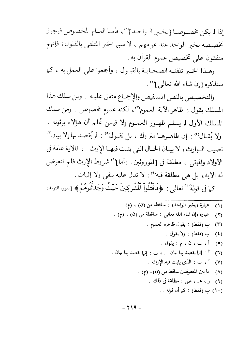 وَالتَّخْصِيصُ بِالنَّصِّ الْمُسْتَفِيضِ وَالْإِجْمَاعِ مُتَّفَقٌ عَلَيْهِ. وَمَنْ سَلَكَ هَذَا الْمَسْلَكَ يَقُولُ: ظَاهِرُ الْآيَةِ الْعُمُومُ (¬3) ، لَكِنَّهُ عُمُومٌ مَخْصُوصٌ. وَمَنْ سَلَكَ الْمَسْلَكَ الْأَوَّلَ لَمْ يُسَلِّمْ ظُهُورَ الْعُمُومِ إِلَّا فِيمَنْ عَلِمَ أَنَّ هَؤُلَاءِ يَرِثُونَهُ، وَلَا يُقَالُ (¬4) : إِنَّ ظَاهِرَهَا مَتْرُوكٌ، بَلْ نَقُولُ (¬5) : لَمْ يُقْصَدْ بِهَا إِلَّا بَيَانُ (¬6) نَصِيبِ الْوَارِثِ، لَا بَيَانُ الْحَالِ الَّتِي يَثْبُتُ فِيهَا الْإِرْثُ (¬7) ، فَالْآيَةُ عَامَّةٌ فِي الْأَوْلَادِ وَالْمَوْتَى، مُطْلَقَةٌ فِي [الْمَوْرُوثِينَ. وَأَمَّا] (¬8) شُرُوطُ الْإِرْثِ فَلَمْ تَتَعَرَّضْ لَهُ الْآيَةُ، بَلْ هِيَ مُطْلَقَةٌ فِيهِ (¬9) : لَا تَدُّلُ عَلَيْهِ بِنَفْيٍ وَلَا إِثْبَاتٍ.