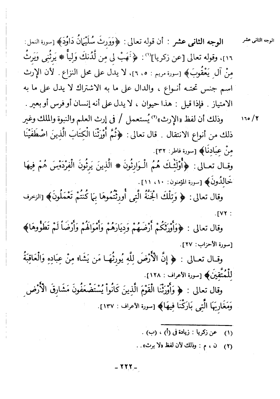 الْوَجْهُ الثَّانِي عَشَرَ: أَنَّ قَوْلَهُ تَعَالَى: {وَوَرِثَ سُلَيْمَانُ دَاوُدَ} [سُورَةِ النَّمْلِ: 16] ، وَقَوْلَهُ تَعَالَى [عَنْ زَكَرِيَّا] (¬1) : {فَهَبْ لِي مِنْ لَدُنْكَ وَلِيًّا يَرِثُنِي وَيَرِثُ مِنْ آلِ يَعْقُوبَ} [سُورَةِ مَرْيَمَ: 5، 6] ، لَا يَدُلُّ عَلَى مَحَلِّ النِّزَاعِ؛ لِأَنَّ الْإِرْثَ اسْمُ جِنْسٍ تَحْتَهُ أَنْوَاعٌ، وَالدَّالُّ عَلَى مَا بِهِ الِاشْتِرَاكُ لَا يَدُلُّ عَلَى مَا بِهِ الِامْتِيَازُ. فَإِذَا قِيلَ: هَذَا حَيَوَانٌ، لَا يَدُلُّ عَلَى أَنَّهُ إِنْسَانٌ أَوْ فَرَسٌ أَوْ بَعِيرٌ. وَذَلِكَ أَنَّ لَفْظَ " الْإِرْثِ " (¬2) يُسْتَعْمَلُ فِي إِرْثِ الْعِلْمِ وَالنُّبُوَّةِ وَالْمُلْكِ وَغَيْرِ ذَلِكَ مِنْ أَنْوَاعِ الِانْتِقَالِ. قَالَ تَعَالَى: {ثُمَّ أَوْرَثْنَا الْكِتَابَ الَّذِينَ اصْطَفَيْنَا مِنْ عِبَادِنَا} [سُورَةِ فَاطِرٍ: 32] .