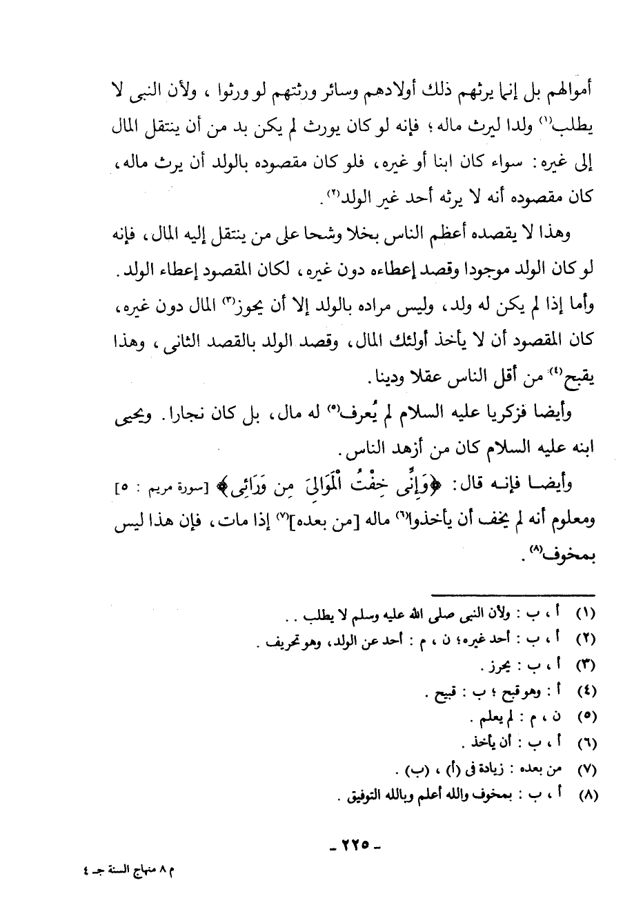 أَمْوَالِهِمْ بَلْ إِنَّمَا يَرِثُهُمْ ذَلِكَ أَوْلَادُهُمْ وَسَائِرُ وَرَثَتِهِمْ لَوْ وَرِثُوا؛ وَلِأَنَّ النَّبِيَّ لَا يَطْلُبُ (¬1) وَلَدًا لِيَرِثَ مَالَهُ؛ فَإِنَّهُ لَوْ كَانَ يُورَثُ لَمْ يَكُنْ بُدٌّ مِنْ أَنْ يَنْتَقِلَ الْمَالُ إِلَى غَيْرِهِ: سَوَاءٌ كَانَ ابْنًا أَوْ غَيْرَهُ، فَلَوْ كَانَ مَقْصُودُهُ بِالْوَلَدِ أَنْ يَرِثَ مَالَهُ، كَانَ مَقْصُودُهُ أَنَّهُ لَا يَرِثُهُ أَحَدٌ غَيْرُ الْوَلَدِ (¬2) .
