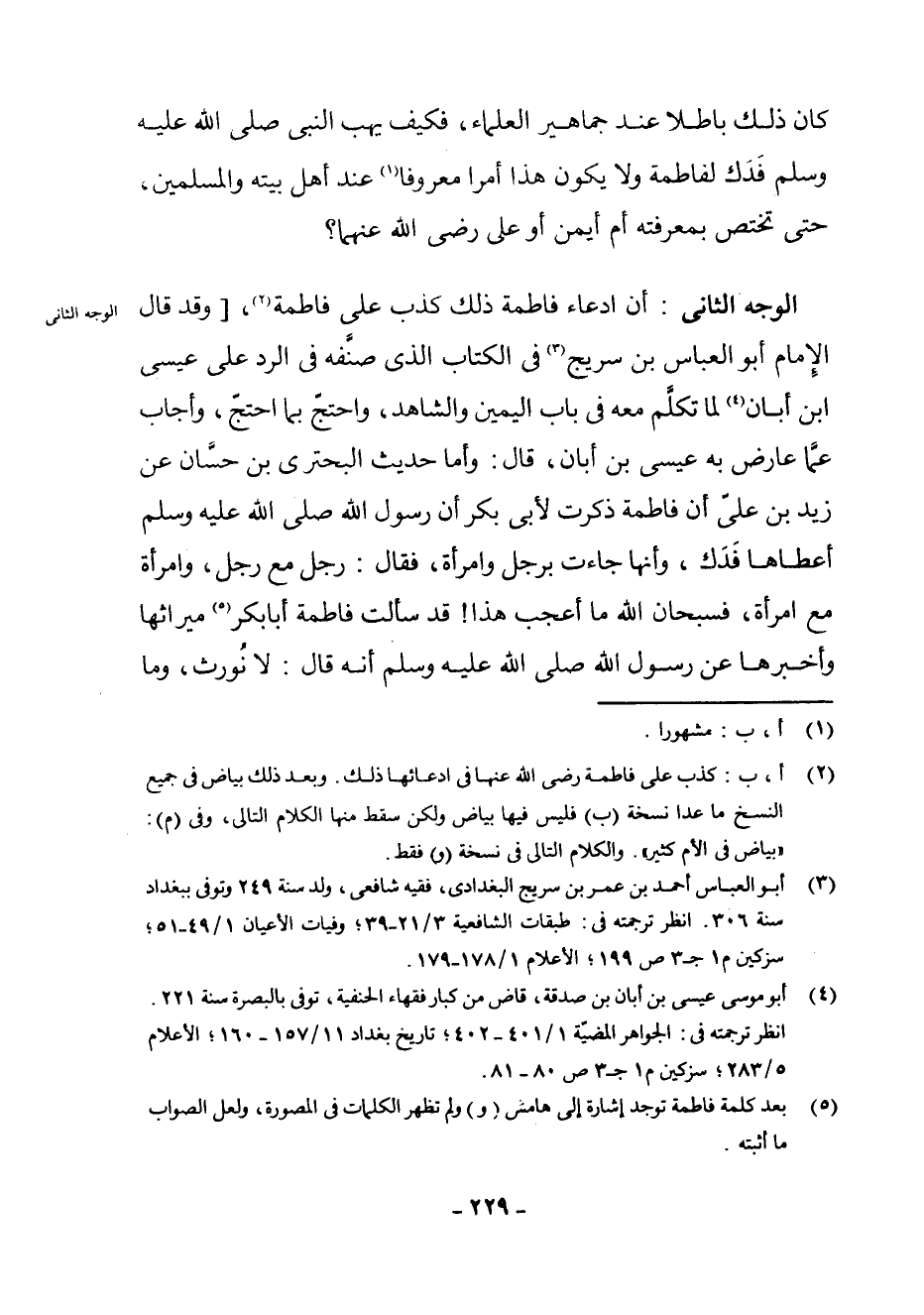 الْوَجْهُ الثَّانِي: أَنَّ ادِّعَاءَ فَاطِمَةَ ذَلِكَ كَذِبٌ عَلَى فَاطِمَةَ (¬2) ، [وَقَدْ قَالَ الْإِمَامُ أَبُو الْعَبَّاسُ بْنُ سُرَيْجٍ (¬3) فِي الْكِتَابِ الَّذِي صَنَّفَهُ فِي الرَّدِّ عَلَى عِيسَى بْنِ أَبَانَ (¬4) لَمَّا تَكَلَّمَ مَعَهُ فِي بَابِ الْيَمِينِ وَالشَّاهِدِ، وَاحْتَجَّ بِمَا احْتَجَّ، وَأَجَابَ عَمَّا عَارَضَ بِهِ عِيسَى بْنَ أَبَانَ، قَالَ: وَأَمَّا حَدِيثُ الْبُحْتُرِيِّ بْنِ حَسَّانٍ عَنْ زَيْدِ بْنِ عَلِيٍّ: أَنَّ فَاطِمَةَ ذَكَرَتْ لِأَبِي بَكْرٍ أَنَّ رَسُولَ اللَّهِ - صَلَّى اللَّهُ عَلَيْهِ وَسَلَّمَ - أَعْطَاهَا فَدَكَ، وَأَنَّهَا جَاءَتْ بِرَجُلٍ وَامْرَأَةٍ، فَقَالَ: رَجُلٌ مَعَ رَجُلٍ، وَامْرَأَةٌ مَعَ امْرَأَةٍ، فَسُبْحَانَ اللَّهِ مَا أَعْجَبَ هَذَا! ! قَدْ سَأَلَتْ فَاطِمَةُ أَبَا بَكْرٍ (¬5) مِيرَاثَهَا وَأَخْبَرَهَا عَنْ رَسُولِ اللَّهِ - صَلَّى اللَّهُ عَلَيْهِ وَسَلَّمَ - أَنَّهُ قَالَ: «لَا نُورَثُ» ، وَمَا