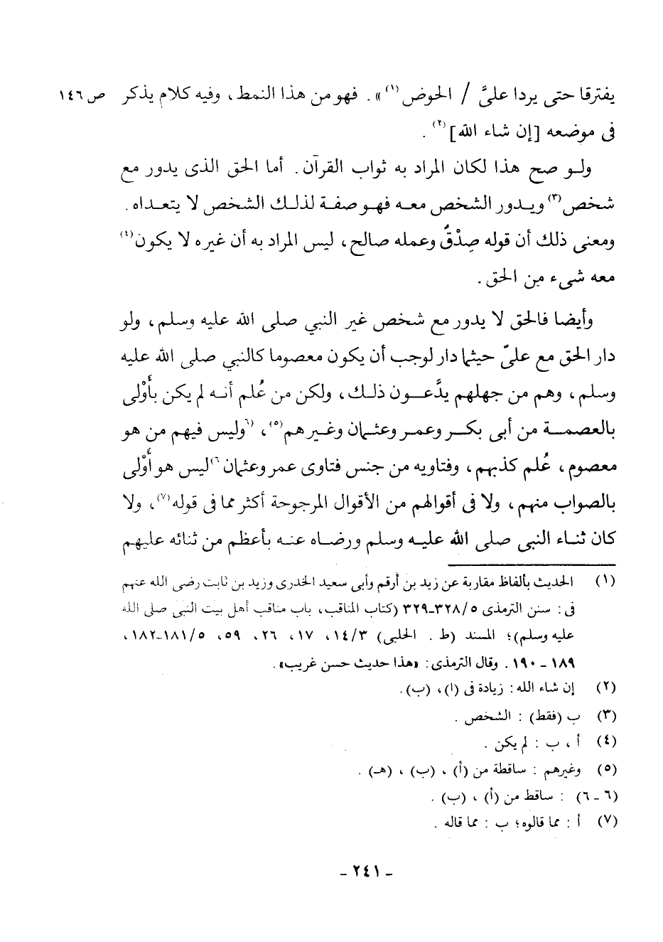 وَأَيْضًا فَالْحَقُّ لَا يَدُورُ مَعَ شَخْصٍ غَيْرِ النَّبِيِّ - صَلَّى اللَّهُ عَلَيْهِ وَسَلَّمَ -، وَلَوْ دَارَ الْحَقُّ مَعَ عَلِيٍّ حَيْثُمَا دَارَ لَوَجَبَ أَنْ يَكُونَ مَعْصُومًا كَالنَّبِيِّ - صَلَّى اللَّهُ عَلَيْهِ وَسَلَّمَ -، وَهُمْ مِنْ جَهْلِهِمْ يَدَّعُونَ ذَلِكَ، وَلَكِنْ مَنْ عَلِمَ أَنَّهُ لَمْ يَكُنْ بِأَوْلَى بِالْعِصْمَةِ مِنْ أَبِي بَكْرٍ وَعُمَرَ وَعُثْمَانَ وَغَيْرِهِمْ (¬5) ، وَلَيْسَ فِيهِمْ مَنْ هُوَ مَعْصُومٌ، عُلِمَ كَذِبُهُمْ، وَفَتَاوِيهِ مِنْ جِنْسِ فَتَاوِي عُمَرَ وَعُثْمَانَ (¬6) لَيْسَ هُوَ أَوْلَى بِالصَّوَابِ مِنْهُمْ، وَلَا فِي أَقْوَالِهِمْ مِنَ الْأَقْوَالِ الْمَرْجُوحَةِ أَكْثَرَ مِمَّا فِي قَوْلِهِ (¬7) ، وَلَا كَانَ ثَنَاءُ النَّبِيِّ - صَلَّى اللَّهُ عَلَيْهِ وَسَلَّمَ - وَرِضَاهُ عَنْهُ بِأَعْظَمَ مِنْ ثَنَائِهِ عَلَيْهِمْ