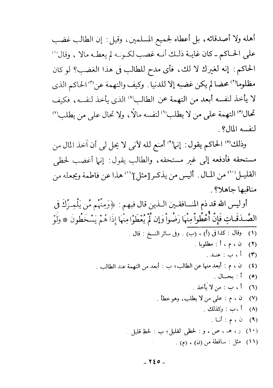 أَهْلِهِ وَلَا أَصْدِقَائِهِ بَلْ أَعْطَاهُ لِجَمِيعِ الْمُسْلِمِينَ، وَقِيلَ: إِنَّ الطَّالِبَ غَضِبَ عَلَى الْحَاكِمِ - كَانَ غَايَةَ ذَلِكَ أَنَّهُ غَضِبَ لِكَوْنِهِ لَمْ يُعْطِهِ مَالًا، وَقَالَ (¬1) الْحَاكِمُ: إِنَّهُ لِغَيْرِكَ لَا لَكَ، فَأَيُّ مَدْحٍ لِلطَّالِبِ فِي هَذَا الْغَضَبِ؟ لَوْ كَانَ مَظْلُومًا (¬2) مَحْضًا لَمْ يَكُنْ غَضَبُهُ إِلَّا لِلدُّنْيَا. وَكَيْفَ وَالتُّهْمَةُ عَنِ (¬3) الْحَاكِمِ الَّذِي لَا يَأْخُذُ لِنَفْسِهِ أَبْعَدُ مِنَ التُّهْمَةِ عَنِ الطَّالِبِ (¬4) الَّذِي يَأْخُذُ لِنَفْسِهِ، فَكَيْفَ تُحَالُ (¬5) التُّهْمَةُ عَلَى مَنْ لَا يَطْلُبُ (¬6) لِنَفْسِهِ مَالًا، وَلَا تُحَالُ عَلَى مَنْ يَطْلُبُ (¬7) لِنَفْسِهِ الْمَالَ؟ .