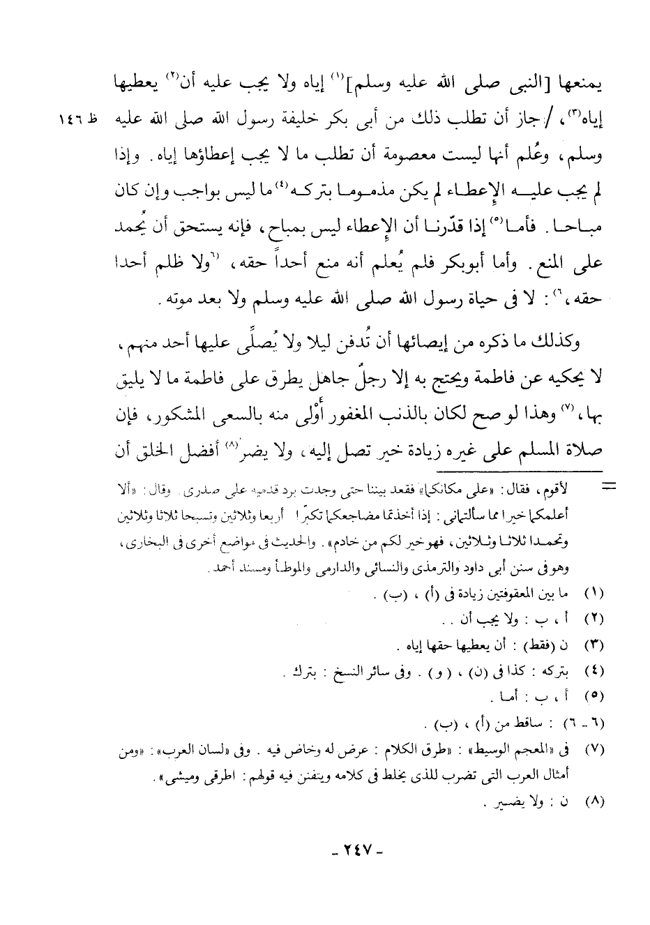 يَمْنَعُهَا [النَّبِيُّ - صَلَّى اللَّهُ عَلَيْهِ وَسَلَّمَ -] (¬1) إِيَّاهُ وَلَا يَجِبُ عَلَيْهِ أَنْ (¬2) يُعْطِيَهَا إِيَّاهُ (¬3) ، جَازَ أَنْ تَطْلُبَ ذَلِكَ مِنْ أَبِي بَكْرٍ خَلِيفَةِ رَسُولِ اللَّهِ - صَلَّى اللَّهُ عَلَيْهِ وَسَلَّمَ -، وَعَلِمَ أَنَّهَا لَيْسَتْ مَعْصُومَةً أَنْ تَطْلُبَ مَا لَا يَجِبُ إِعْطَاؤُهَا إِيَّاهُ. وَإِذَا لَمْ يَجِبْ عَلَيْهِ الْإِعْطَاءُ لَمْ يَكُنْ مَذْمُومًا بِتَرْكِهِ (¬4) مَا لَيْسَ بِوَاجِبٍ وَإِنْ كَانَ مُبَاحًا. فَأَمَّا (¬5) إِذَا قَدَّرْنَا أَنَّ الْإِعْطَاءَ لَيْسَ بِمُبَاحٍ، فَإِنَّهُ يَسْتَحِقُّ أَنْ يُحْمَدَ عَلَى الْمَنْعِ. وَأَمَّا أَبُو بَكْرٍ فَلَمْ يُعْلَمْ أَنَّهُ مَنَعَ أَحَدًا حَقَّهُ، وَلَا ظَلَمَ أَحَدًا حَقَّهُ، (¬6) لَا فِي حَيَاةِ رَسُولِ اللَّهِ - صَلَّى اللَّهُ عَلَيْهِ وَسَلَّمَ - وَلَا بَعْدَ مَوْتِهِ.