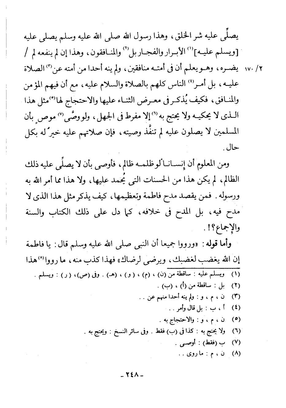 يُصَلِّيَ عَلَيْهِ شَرُّ الْخَلْقِ، وَهَذَا رَسُولُ اللَّهِ - صَلَّى اللَّهُ عَلَيْهِ وَسَلَّمَ - يُصَلِّي عَلَيْهِ [وَيُسَلِّمُ عَلَيْهِ] (¬1) الْأَبْرَارُ وَالْفُجَّارُ بَلْ (¬2) وَالْمُنَافِقُونَ، وَهَذَا إِنْ لَمْ يَنْفَعْهُ لَمْ يَضُرَّهُ، وَهُوَ يَعْلَمُ أَنَّ فِي أُمَّتِهِ مُنَافِقِينَ، وَلَمْ يَنْهَ أَحَدًا مِنْ أُمَّتِهِ عَنِ (¬3) الصَّلَاةِ عَلَيْهِ، بَلْ أَمَرَ (¬4) النَّاسَ كُلَّهُمْ بِالصَّلَاةِ وَالسَّلَامِ عَلَيْهِ، مَعَ أَنَّ فِيهِمُ الْمُؤْمِنَ وَالْمُنَافِقَ، فَكَيْفَ يُذْكَرُ فِي مَعْرِضِ الثَّنَاءِ عَلَيْهَا وَالِاحْتِجَاجِ لَهَا (¬5) مِثْلُ هَذَا الَّذِي لَا يَحْكِيهِ وَلَا يَحْتَجُّ بِهِ (¬6) إِلَّا مُفْرِطٌ فِي الْجَهْلِ، وَلَوْ وَصَّى (¬7) مُوصٍ بِأَنَّ الْمُسْلِمِينَ لَا يُصَلُّونَ عَلَيْهِ لَمْ تُنَفَّذْ وَصِيَّتُهُ، فَإِنَّ صَلَاتَهُمْ عَلَيْهِ خَيْرٌ لَهُ بِكُلِّ حَالٍ.