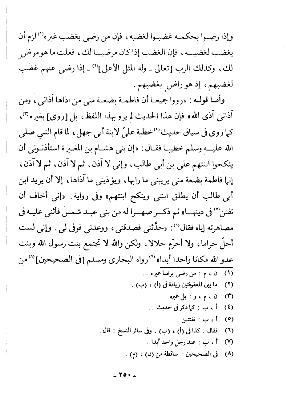 وَأَمَّا قَوْلُهُ: " رَوَوْا جَمِيعًا «أَنَّ فَاطِمَةَ بِضْعَةٌ مِنِّي مَنْ آذَاهَا آذَانِي، وَمَنْ آذَانِي آذَى اللَّهَ» " فَإِنَّ هَذَا الْحَدِيثَ لَمْ يُرْوَ بِهَذَا اللَّفْظِ، بَلْ [رُوِيَ] بِغَيْرِهِ (¬3) ، كَمَا رُوِيَ فِي سِيَاقِ حَدِيثِ (¬4) خِطْبَةِ عَلِيٍّ لِابْنَةِ أَبِي جَهْلٍ، لَمَّا قَامَ النَّبِيُّ - صَلَّى اللَّهُ عَلَيْهِ وَسَلَّمَ - خَطِيبًا فَقَالَ: «إِنَّ بَنِي هِشَامِ بْنِ الْمُغِيرَةِ اسْتَأْذَنُونِي أَنْ يَنْكِحُوا ابْنَتَهُمْ عَلِيَّ بْنَ أَبِي طَالِبٍ، وَإِنِّي لَا آذَنُ، ثُمَّ لَا آذَنُ، ثُمَّ لَا آذَنُ، إِنَّمَا فَاطِمَةُ بِضْعَةٌ مِنِّي يُرِيبُنِي مَا رَابَهَا، وَيُؤْذِينِي مَا آذَاهَا، إِلَّا أَنْ يُرِيدَ ابْنُ أَبِي طَالِبٍ أَنْ يُطَلِّقَ ابْنَتِي وَيَنْكِحَ ابْنَتَهُمْ» " وَفِي رِوَايَةٍ: " إِنِّي أَخَافُ أَنْ تُفْتَنَ (¬5) فِي دِينِهَا " ثُمَّ ذَكَرَ صِهْرًا لَهُ مِنْ بَنِي عَبْدِ شَمْسٍ فَأَثْنَى عَلَيْهِ فِي مُصَاهَرَتِهِ إِيَّاهُ فَقَالَ (¬6) : " حَدَّثَنِي فَصَدَقَنِي، وَوَعَدَنِي فَوَفَّى لِي. وَإِنِّي لَسْتُ أُحِلُّ حَرَامًا، وَلَا أُحَرِّمُ حَلَالًا، وَلَكِنْ وَاللَّهِ لَا تَجْتَمِعُ بِنْتُ رَسُولِ اللَّهِ وَبِنْتُ عَدُوِّ اللَّهِ مَكَانًا وَاحِدًا أَبَدًا " (¬7) رَوَاهُ الْبُخَارِيُّ وَمُسْلِمٌ [فِي الصَّحِيحَيْنِ] (¬8) مِنْ