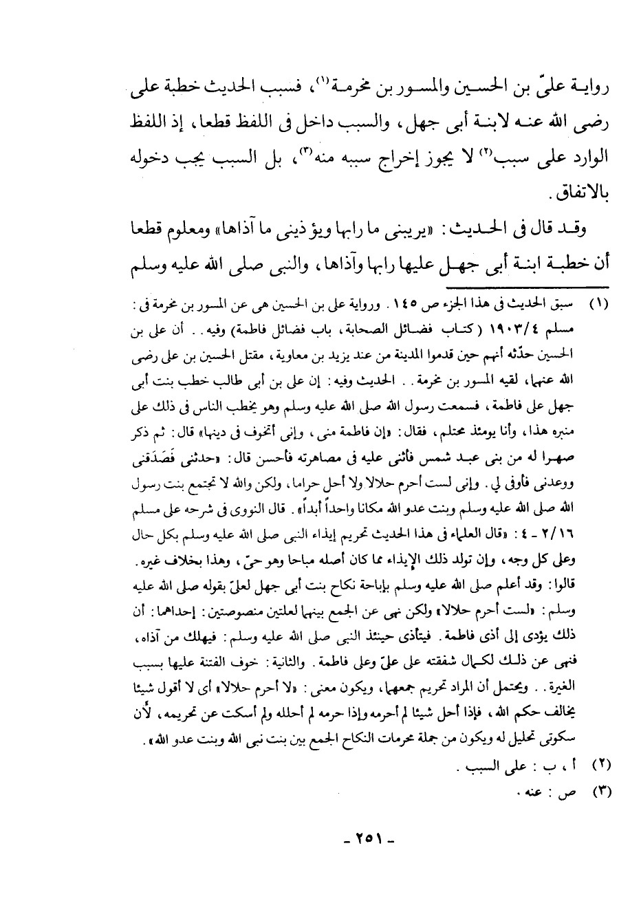 رِوَايَةِ عَلِيِّ بْنِ الْحُسَيْنِ وَالْمِسْوَرِ بْنِ مَخْرَمَةَ سَبَقَ الْحَدِيثُ فِي هَذَا الْجُزْءِ ص 145. وَرِوَايَةُ عَلِيِّ بْنِ الْحُسَيْنِ هِيَ عَنِ الْمِسْوَرِ بْنِ مَخْرَمَةَ فِي: مُسْلِمٍ 4/1903 (كِتَابُ فَضَائِلِ الصَّحَابَةِ، بَابُ فَضَائِلِ فَاطِمَةَ) وَفِيهِ. . أَنَّ عَلِيَّ بْنَ الْحُسَيْنِ حَدَّثَهُ أَنَّهُمْ حِينَ قَدِمُوا الْمَدِينَةَ مِنْ عِنْدِ يَزِيدَ بْنِ مُعَاوِيَةَ، مَقْتَلِ الْحُسَيْنِ بْنِ عَلِيٍّ - رَضِيَ اللَّهُ عَنْهُمَا -، لَقِيَهُ الْمِسْوَرُ بْنُ مَخْرَمَةَ. . . الْحَدِيثَ وَفِيهِ: «إِنَّ عَلِيَّ بْنَ أَبِي طَالِبٍ خَطَبَ بِنْتَ أَبِي جَهْلٍ عَلَى فَاطِمَةَ، فَسَمِعَتْ رَسُولَ اللَّهِ - صَلَّى اللَّهُ عَلَيْهِ وَسَلَّمَ - وَهُوَ يَخْطُبُ النَّاسَ فِي ذَلِكَ عَلَى مِنْبَرِهِ هَذَا، وَأَنَا يَوْمَئِذٍ مُحْتَلِمٌ، فَقَالَ: " إِنَّ فَاطِمَةَ مِنِّي، وَإِنِّي أَتَخَوَّفُ فِي دِينِهَا ". قَالَ: ثُمَّ ذَكَرَ صِهْرًا لَهُ مِنْ بَنِي عَبْدِ شَمْسٍ فَأَثْنَى عَلَيْهِ فِي مُصَاهَرَتِهِ فَأَحْسَنَ قَالَ: " حَدَّثَنِي فَصَدَقَنِي وَوَعَدَنِي فَأَوْفَى لِي. وَإِنِّي لَسْتُ أُحَرِّمُ حَلَالًا وَلَا أُحِلُّ حَرَامًا، وَلَكِنْ وَاللَّهِ لَا تَجْتَمِعُ بِنْتُ رَسُولِ اللَّهِ - صَلَّى اللَّهُ عَلَيْهِ وَسَلَّمَ - وَبِنْتُ عَدُوِّ اللَّهِ مَكَانًا وَاحِدًا أَبَدًا» ". قَالَ النَّوَوِيُّ فِي شَرْحِهِ عَلَى مُسْلِمٍ 16/24: " قَالَ الْعُلَمَاءُ فِي هَذَا الْحَدِيثِ تَحْرِيمُ إِيذَاءِ النَّبِيِّ - صَلَّى اللَّهُ عَلَيْهِ وَسَلَّمَ - بِكُلِّ حَالٍ وَعَلَى كُلِّ وَجْهٍ، وَإِنْ تَوَلَّدَ ذَلِكَ الْإِيذَاءُ مِمَّا كَانَ أَصْلُهُ مُبَاحًا وَهُوَ حَيٌّ، وَهَذَا بِخِلَافِ غَيْرِهِ. قَالُوا: وَقَدْ أَعْلَمَ - صَلَّى اللَّهُ عَلَيْهِ وَسَلَّمَ - بِإِبَاحَةِ نِكَاحِ بِنْتِ أَبِي جَهْلٍ لِعَلِيٍّ بِقَوْلِهِ - صَلَّى اللَّهُ عَلَيْهِ وَسَلَّمَ -: " لَسْتُ أُحَرِّمُ حَلَالًا ". وَلَكِنْ نَهَى عَنِ الْجَمْعِ بَيْنَهُمَا لِعِلَّتَيْنِ مَنْصُوصَتَيْنِ: إِحْدَاهُمَا: أَنَّ ذَلِكَ يُؤَدِّي إِلَى أَذَى فَاطِمَةَ. فَيَتَأَذَّى حِينَئِذٍ النَّبِيُّ - صَلَّى اللَّهُ عَلَيْهِ وَسَلَّمَ -: فَيَهْلِكُ مَنْ آذَاهُ، فَنَهَى عَنْ ذَلِكَ لِكَمَالِ شَفَقَتِهِ عَلَى عَلِيٍّ وَعَلَى فَاطِمَةَ. وَالثَّانِيَةُ: خَوْفُ الْفِتْنَةِ عَلَيْهَا بِسَبَبِ الْغَيْرَةِ. . وَيُحْتَمَلُ أَنَّ الْمُرَادَ: تَحْرِيمُ جَمْعِهِمَا، وَيَكُونُ مَعْنَى: " «لَا أُحَرِّمُ حَلَالًا» " أَيْ لَا أَقُولُ شَيْئًا يُخَالِفُ حُكْمَ اللَّهِ، فَإِذَا أَحَلَّ شَيْئًا لَمْ أُحَرِّمْهُ وَإِذَا حَرَّمَهُ لَمْ أُحَلِّلْهُ وَلَمْ أَسْكُتْ عَنْ تَحْرِيمِهِ، لِأَنَّ سُكُوتِي تَحْلِيلٌ لَهُ وَيَكُونُ مِنْ جُمْلَةِ مُحَرَّمَاتِ النِّكَاحِ الْجَمْعُ بَيْنَ بِنْتِ نَبِيِّ اللَّهِ وَبِنْتِ عَدُوِّ اللَّهِ ".، فَسَبَبُ الْحَدِيثِ خِطْبَةُ عَلِيٍّ - رَضِيَ اللَّهُ عَنْهُ - لِابْنَةِ أَبِي جَهْلٍ، وَالسَّبَبُ دَاخِلٌ فِي اللَّفْظِ قَطْعًا، إِذِ اللَّفْظُ الْوَارِدُ عَلَى سَبَبٍ (¬1) لَا يَجُوزُ إِخْرَاجُ سَبَبِهِ مِنْهُ (¬2) ، بَلِ السَّبَبُ يَجِبُ دُخُولُهُ بِالِاتِّفَاقِ.