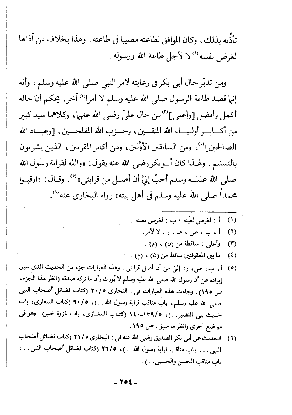 (¬5) أ، ب، ص، ر: إِلَيَّ مِنْ أَنْ أَصِلَ قَرَابَتِي. وَهَذِهِ الْعِبَارَاتُ جُزْءٌ مِنَ الْحَدِيثِ الَّذِي سَبَقَ إِيرَادُهُ عَنْ رَسُولِ اللَّهِ - صَلَّى اللَّهُ عَلَيْهِ وَسَلَّمَ - لَا يُورَثُ وَأَنَّ مَا تَرَكَهُ صَدَقَةٌ (انْظُرْ هَذَا الْجُزْءَ، ص [0 - 9] 95) . وَجَاءَتْ هَذِهِ الْعِبَارَاتُ فِي الْبُخَارِيِّ 5/20 (كِتَابُ فَضَائِلِ أَصْحَابِ النَّبِيِّ - صَلَّى اللَّهُ عَلَيْهِ وَسَلَّمَ -، بَابُ مَنَاقِبِ قَرَابَةِ رَسُولِ اللَّهِ. .) ، 5/90 (كِتَابُ الْمَغَازِي، بَابُ حَدِيثِ بَنِي النَّضِيرِ. .) ، 5/139 - 140 (كِتَابُ الْمَغَازِي، بَابُ غَزْوَةِ خَيْبَرَ) . وَهُوَ فِي مَوَاضِعَ أُخْرَى وَانْظُرْ مَا سَبَقَ، ص 195.