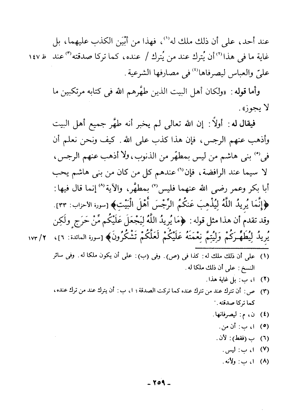 وَأَمَّا قَوْلُهُ: " وَلَكَانَ أَهْلُ الْبَيْتِ الَّذِينَ طَهَّرَهُمُ اللَّهُ فِي كِتَابِهِ مُرْتَكِبِينَ مَا لَا يَجُوزُ ".