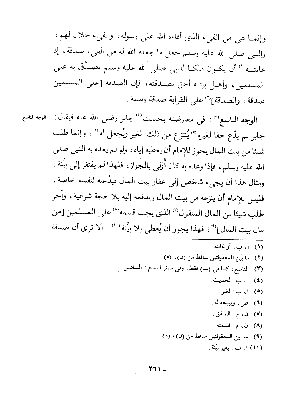 الْوَجْهُ التَّاسِعُ (¬3) : فِي مُعَارَضَتِهِ بِحَدِيثِ (¬4) جَابِرٍ - رَضِيَ اللَّهُ عَنْهُ - فَيُقَالُ: جَابِرٌ لَمْ يَدَعْ حَقًّا لِغَيْرِهِ (¬5) يُنْتَزَعُ مِنْ ذَلِكَ الْغَيْرِ وَيُجْعَلُ لَهُ (¬6) ، وَإِنَّمَا طَلَبَ شَيْئًا مِنْ بَيْتِ الْمَالِ يَجُوزُ لِلْإِمَامِ أَنْ يُعْطِيَهُ إِيَّاهُ، وَلَوْ لَمْ يَعِدْهُ بِهِ النَّبِيُّ - صَلَّى اللَّهُ عَلَيْهِ وَسَلَّمَ - فَإِذَا وَعَدَهُ بِهِ كَانَ أَوْلَى بِالْجَوَازِ، فَلِهَذَا لَمْ يَفْتَقِرْ إِلَى بَيِّنَةٍ. وَمِثَالُ هَذَا أَنْ يَجِيءَ شَخْصٌ إِلَى عَقَارِ بَيْتِ الْمَالِ فَيَدَّعِيهِ لِنَفْسِهِ خَاصَّةً، فَلَيْسَ لِلْإِمَامِ أَنْ يَنْزَعَهُ مِنْ بَيْتِ الْمَالِ وَيَدْفَعَهُ إِلَيْهِ بِلَا حُجَّةٍ شَرْعِيَّةٍ، وَآخَرُ طَلَبَ شَيْئًا مِنَ الْمَالِ الْمَنْقُولِ (¬7) الَّذِي يَجِبُ قَسْمَهُ (¬8) عَلَى الْمُسْلِمِينَ [مِنْ مَالِ بَيْتِ الْمَالِ] (¬9) ; فَهَذَا يَجُوزُ أَنْ يُعْطَى بِلَا بَيِّنَةٍ (¬10) . أَلَا تَرَى أَنَّ صَدَقَةَ