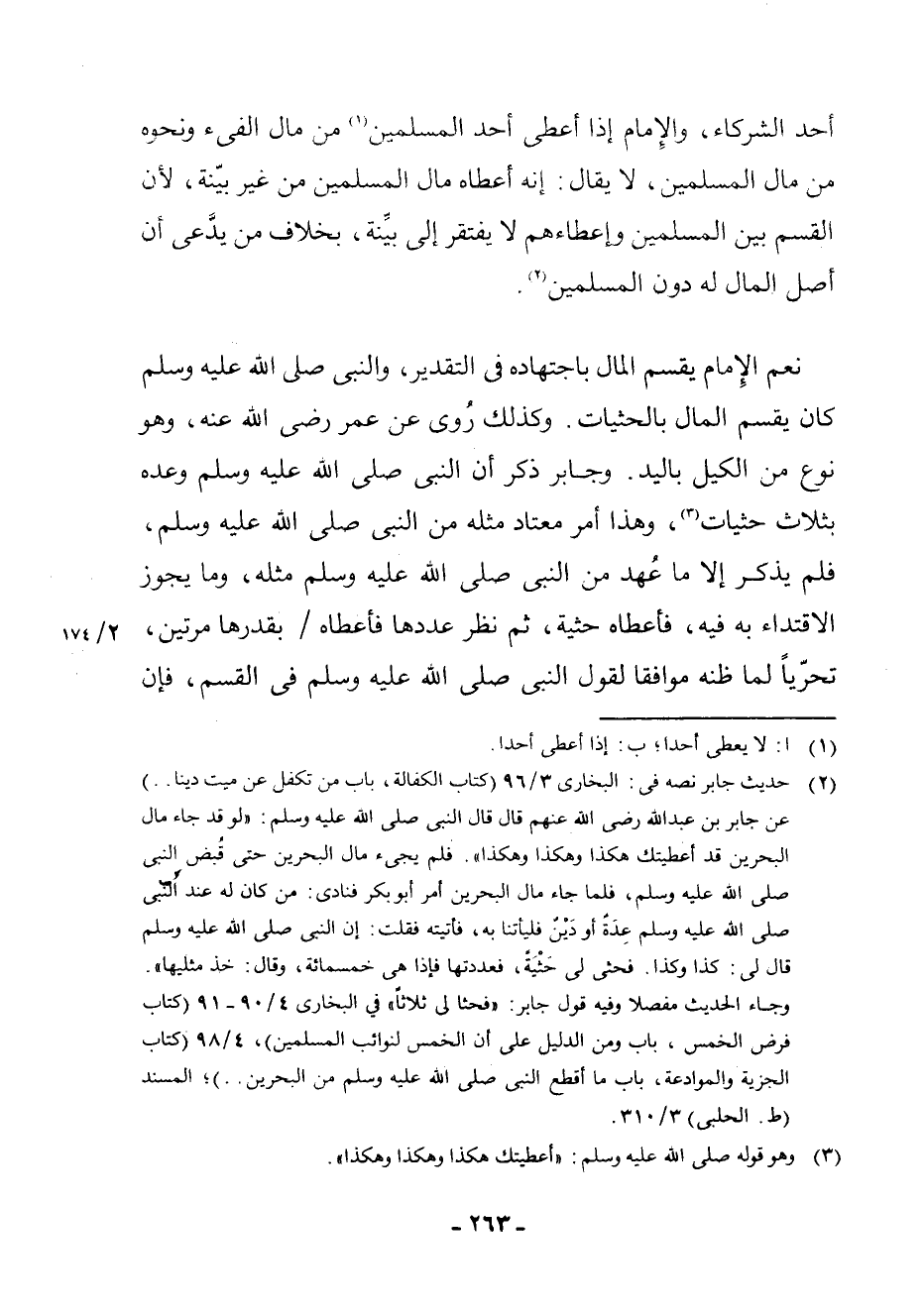 (¬2) حَدِيثُ جَابِرٍ نَصُّهُ فِي: الْبُخَارِيِّ 3/96 (كِتَابُ الْكَفَالَةِ، بَابُ مَنْ تَكَفَّلَ عَنْ مَيِّتٍ دَيْنًا. .) عَنْ جَابِرِ بْنِ عَبْدِ اللَّهِ - رَضِيَ اللَّهُ عَنْهُمْ - قَالَ: قَالَ النَّبِيُّ - صَلَّى اللَّهُ عَلَيْهِ وَسَلَّمَ -: " لَوْ قَدْ جَاءَ مَالُ الْبَحْرِينِ قَدْ أَعْطَيْتُكَ هَكَذَا وَهَكَذَا وَهَكَذَا ". فَلَمْ يَجِئْ مَالُ الْبَحْرِينِ حَتَّى قُبِضَ النَّبِيُّ - صَلَّى اللَّهُ عَلَيْهِ وَسَلَّمَ - فَلَمَّا جَاءَ مَالُ الْبَحْرِينِ أَمَرَ أَبُو بَكْرٍ فَنَادَى: مَنْ كَانَ لَهُ عِنْدَ النَّبِيِّ - صَلَّى اللَّهُ عَلَيْهِ وَسَلَّمَ - عِدَةٌ أَوْ دَيْنٌ فَلْيَأْتِنَا بِهِ، فَأَتَيْتُهُ فَقُلْتُ: إِنَّ النَّبِيَّ - صَلَّى اللَّهُ عَلَيْهِ وَسَلَّمَ - قَالَ لِي: كَذَا وَكَذَا. فَحَثَى إِلَيَّ حَثْيَةً، فَعَدَدْتُهَا فَإِذَا هِيَ خَمْسُمِائَةٍ، وَقَالَ: خُذْ مِثْلَيْهَا ". وَجَاءَ الْحَدِيثُ مُفَصَّلًا وَفِيهِ قَوْلُ جَابِرٍ: " فَحَثَا لِي ثَلَاثًا " فِي الْبُخَارِيِّ 4/90 - 91 (كِتَابُ فَرْضِ الْخُمْسِ، بَابُ وَمِنَ الدَّلِيلِ عَلَى أَنَّ الْخُمْسَ لِنَوَائِبِ الْمُسْلِمِينَ) ، 4/98 (كِتَابُ الْجِزْيَةِ وَالْمُوَادَعَةِ، بَابُ مَا أَقْطَعَ النَّبِيُّ - صَلَّى اللَّهُ عَلَيْهِ وَسَلَّمَ - مِنَ الْبَحْرِينِ. .) ; الْمُسْنَدَ (ط. الْحَلَبِيِّ) 3/310.