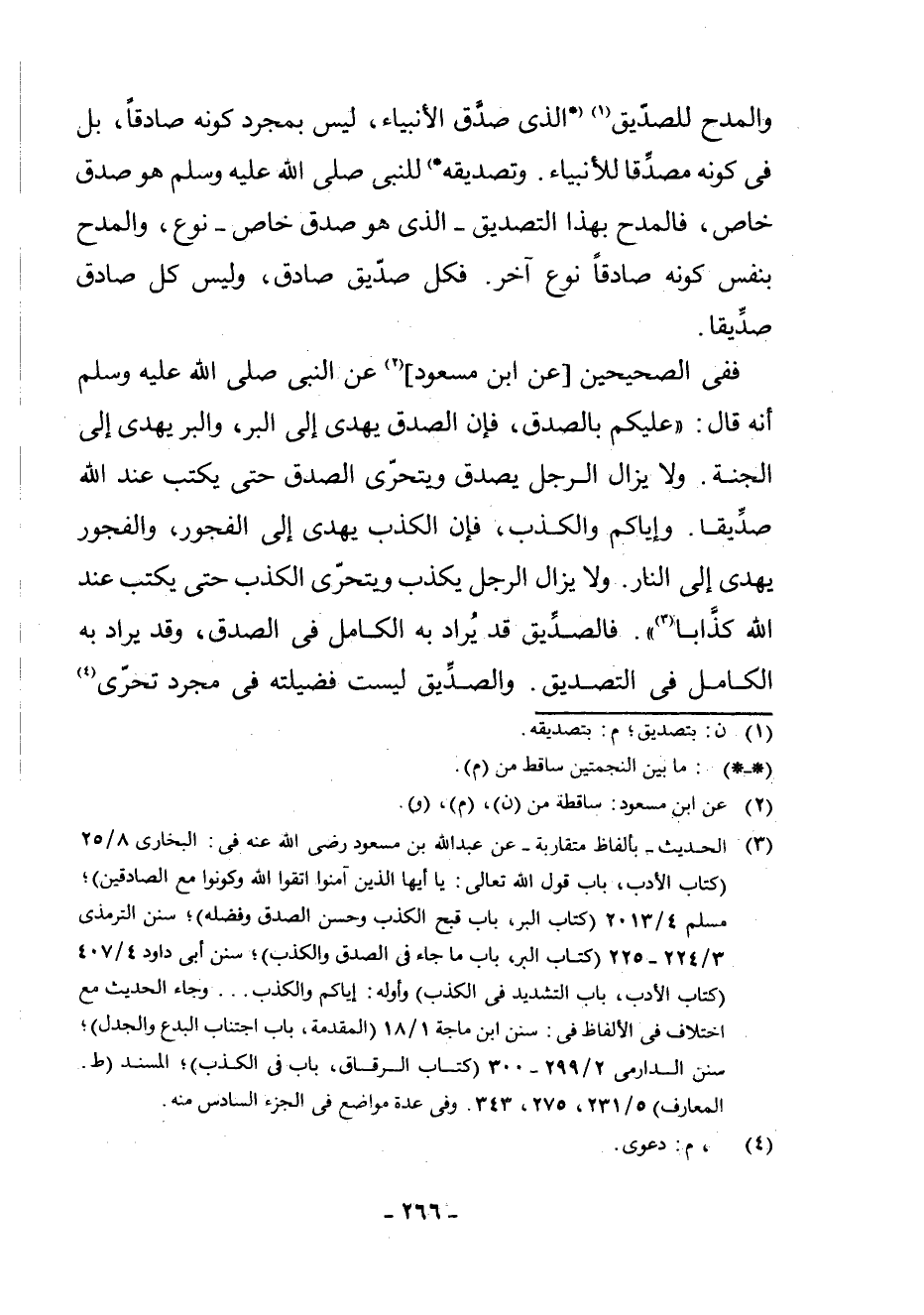 (¬4) الْحَدِيثُ - بِأَلْفَاظٍ مُتَقَارِبَةٍ - عَنْ عَبْدِ اللَّهِ بْنِ مَسْعُودٍ - رَضِيَ اللَّهُ عَنْهُ - فِي: الْبُخَارِيِّ 8/25 (كِتَابُ الْأَدَبِ، بَابُ قَوْلِ اللَّهِ تَعَالَى: (يَا أَيُّهَا الَّذِينَ آمَنُوا اتَّقُوا اللَّهَ وَكُونُوا مَعَ الصَّادِقِينَ) ; مُسْلِمٍ 4/2013 (كِتَابُ الْبِرِّ، بَابُ قُبْحِ الْكَذِبِ وَحُسْنِ الصِّدْقِ وَفَضْلِهِ) ; سُنَنِ التِّرْمِذِيِّ 3/224 - 225 (كِتَابُ الْبِرِّ، بَابُ مَا جَاءَ فِي الصِّدْقِ وَالْكَذِبِ) ; سُنَنِ أَبِي دَاوُدَ 4/407 (كِتَابُ الْأَدَبِ، بَابُ التَّشْدِيدِ فِي الْكَذِبِ) وَأَوَّلُهُ: إِيَّاكُمْ وَالْكَذِبَ. . . وَجَاءَ الْحَدِيثُ مَعَ اخْتِلَافٍ فِي الْأَلْفَاظِ فِي: سُنَنِ ابْنِ مَاجَهْ 1/18 (الْمُقَدِّمَةُ، بَابُ اجْتِنَابِ الْبِدَعِ وَالْجَدَلِ) ; سُنَنِ الدَّارِمِيِّ 2/299 - 300 (كِتَابُ الرِّقَاقُ، بَابٌ فِي الْكَذِبِ) ، الْمُسْنَدِ (ط. الْمَعَارِفِ) 5/231، 275، 343. وَفِي عِدَّةِ مَوَاضِعَ فِي الْجُزْءِ السَّادِسِ مِنْهُ.