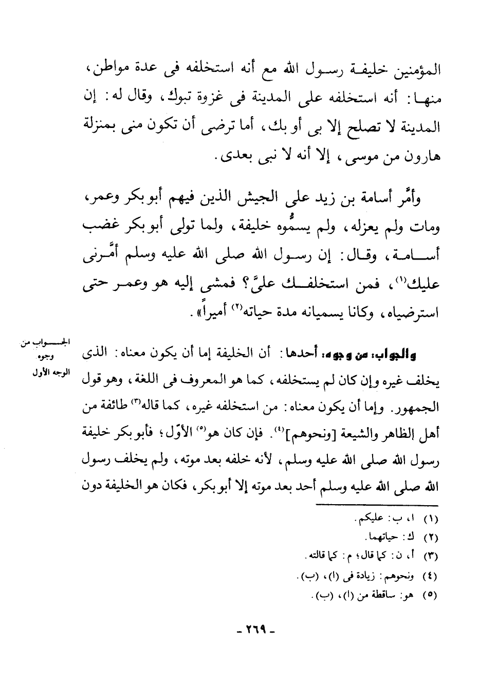 وَالْجَوَابُ مِنْ وُجُوهٍ: أَحَدُهَا: أَنَّ الْخَلِيفَةَ إِمَّا أَنْ يَكُونَ مَعْنَاهُ: الَّذِي يَخْلُفُ غَيْرَهُ وَإِنْ كَانَ لَمْ يَسْتَخْلِفْهُ، كَمَا هُوَ الْمَعْرُوفُ فِي اللُّغَةِ، وَهُوَ قَوْلُ الْجُمْهُورِ. وَإِمَّا أَنْ يَكُونَ مَعْنَاهُ: مَنِ اسْتَخْلَفَهُ غَيْرُهُ، كَمَا قَالَهُ (¬3) . طَائِفَةٌ مِنْ أَهْلِ الظَّاهِرِ وَالشِّيعَةِ [وَنَحْوِهِمْ] (¬4) . فَإِنْ كَانَ هُوَ (¬5) الْأَوَّلُ ; فَأَبُو بَكْرٍ خَلِيفَةُ رَسُولِ اللَّهِ - صَلَّى اللَّهُ عَلَيْهِ وَسَلَّمَ - لِأَنَّهُ خَلَفَهُ بَعْدَ مَوْتِهِ، وَلَمْ يَخْلُفْ رَسُولَ اللَّهِ - صَلَّى اللَّهُ عَلَيْهِ وَسَلَّمَ - أَحَدٌ بَعْدَ مَوْتِهِ إِلَّا أَبُو بَكْرٍ، فَكَانَ هُوَ الْخَلِيفَةُ دُونَ
