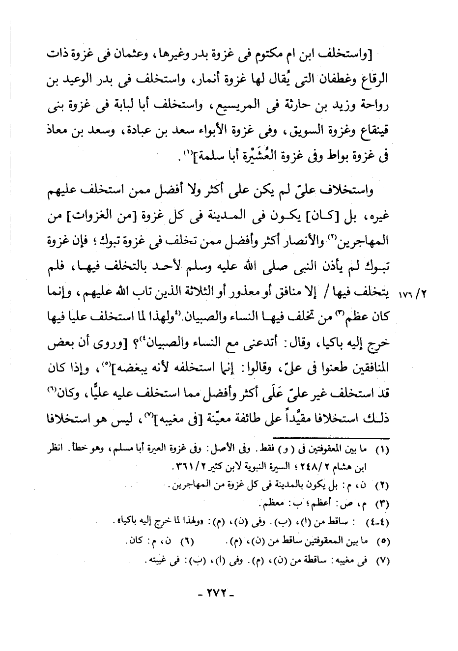 وَاسْتِخْلَافُ عَلِيٍّ لَمْ يَكُنْ عَلَى أَكْثَرَ وَلَا أَفْضَلَ مِمَّنِ اسْتَخْلَفَ عَلَيْهِمْ غَيْرَهُ، بَلْ [كَانَ] يَكُونُ فِي الْمَدِينَةِ فِي كُلِّ غَزْوَةٍ [مِنَ الْغَزَوَاتِ] مِنَ الْمُهَاجِرِينَ (¬2) وَالْأَنْصَارِ أَكْثَرُ وَأَفْضَلُ مِمَّنْ تَخَلَّفَ فِي غَزْوَةِ تَبُوكَ ; فَإِنَّ غَزْوَةَ تَبُوكَ لَمْ يَأْذَنِ النَّبِيُّ - صَلَّى اللَّهُ عَلَيْهِ وَسَلَّمَ - لِأَحَدٍ بِالتَّخَلُّفِ فِيهَا، فَلَمْ يَتَخَلَّفْ فِيهَا إِلَّا مُنَافِقٌ أَوْ مَعْذُورٌ أَوِ الثَّلَاثَةُ الَّذِينَ تَابَ اللَّهُ عَلَيْهِمْ، وَإِنَّمَا كَانَ عِظَمُ (¬3) مَنْ تَخَلَّفَ فِيهَا النِّسَاءُ وَالصِّبْيَانُ. وَلِهَذَا لَمَّا اسْتَخْلَفَ عَلِيًّا فِيهَا خَرَجَ إِلَيْهِ بَاكِيًا، وَقَالَ: أَتَدَعُنِي مَعَ النِّسَاءِ وَالصِّبْيَانِ (4 - 4) : (¬4) ؟ [وَرُوِيَ أَنَّ بَعْضَ الْمُنَافِقِينَ طَعَنُوا فِي عَلِيٍّ، وَقَالُوا: إِنَّمَا اسْتَخْلَفَهُ لِأَنَّهُ يُبْغِضُهُ] (¬5) وَإِذَا كَانَ قَدِ اسْتَخْلَفَ غَيْرَ عَلِيٍّ عَلَى أَكْثَرَ وَأَفْضَلَ مِمَّا اسْتَخْلَفَ عَلَيْهِ عَلِيًّا، وَكَانَ (¬6) ذَلِكَ اسْتِخْلَافًا مُقَيَّدًا عَلَى طَائِفَةٍ مُعَيَّنَةٍ [فِي مَغِيبِهِ] (¬7) ، لَيْسَ هُوَ اسْتِخْلَافًا