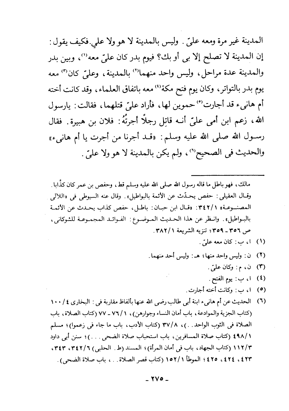 الْمَدِينَةِ غَيْرَ مَرَّةٍ وَمَعَهُ عَلِيٌّ، وَلَيْسَ بِالْمَدِينَةِ لَا هُوَ وَلَا عَلِيٌّ. فَكَيْفَ يَقُولُ: إِنَّ الْمَدِينَةَ لَا تَصْلُحُ إِلَّا بِي أَوْ بِكَ؟ فَيَوْمَ بَدْرٍ كَانَ عَلِيٌّ مَعَهُ (¬1) ، وَبَيْنَ بَدْرٍ وَالْمَدِينَةِ عِدَّةُ مَرَاحِلَ، وَلَيْسَ وَاحِدٌ مِنْهُمَا (¬2) بِالْمَدِينَةِ، وَعَلِيٌّ كَانَ (¬3) مَعَهُ يَوْمَ بَدْرٍ بِالتَّوَاتُرِ، وَكَانَ يَوْمَ فَتْحِ مَكَّةَ (¬4) مَعَهُ بِاتِّفَاقِ الْعُلَمَاءِ، «وَقَدْ كَانَتْ أُخْتُهُ أُمُّ هَانِئٍ قَدْ أَجَارَتْ (¬5) حَمَوَيْنِ لَهَا، فَأَرَادَ عَلِيٌّ قَتْلَهُمَا، فَقَالَتْ: يَا رَسُولَ اللَّهِ، زَعَمَ ابْنُ أُمِّي عَلِيٌّ أَنَّهُ قَاتِلَ رَجُلًا أَجَرْتُهُ: فُلَانَ بْنَ هُبَيْرَةَ. فَقَالَ رَسُولُ اللَّهِ - صَلَّى اللَّهُ عَلَيْهِ وَسَلَّمَ -: " قَدْ أَجَرْنَا مَنْ أَجَرْتِ يَا أُمَّ هَانِئٍ» وَالْحَدِيثُ فِي الصَّحِيحِ (¬6) ، وَلَمْ يَكُنْ بِالْمَدِينَةِ لَا هُوَ وَلَا عَلِيٌّ.