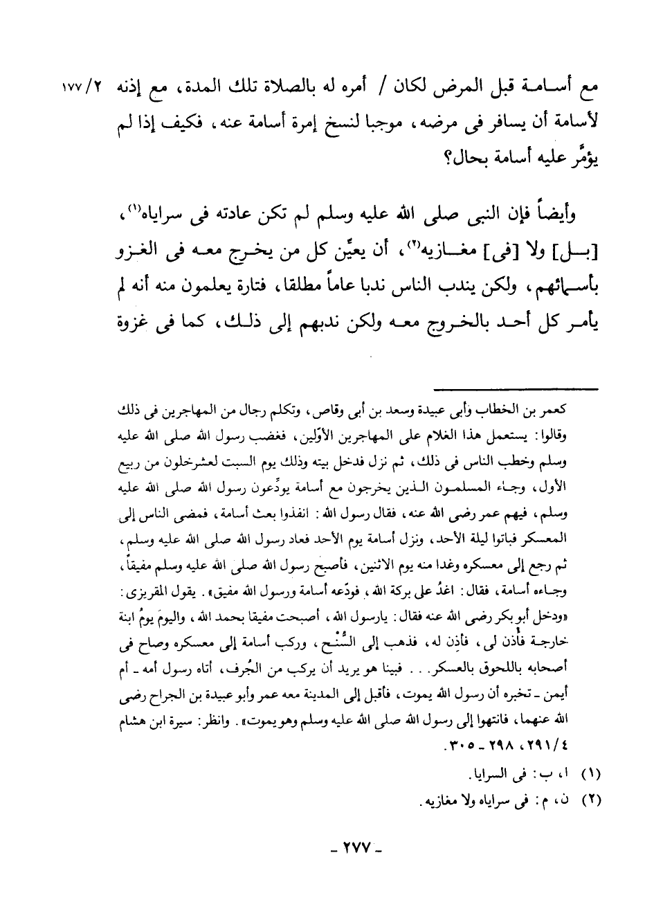 مَعَ أُسَامَةَ قَبْلَ الْمَرَضِ لَكَانَ أَمْرُهُ لَهُ بِالصَّلَاةِ تِلْكَ الْمُدَّةِ، مَعَ إِذْنِهِ لِأُسَامَةَ أَنْ يُسَافِرَ فِي مَرَضِهِ، مُوجِبًا لِنَسْخِ إِمْرَةِ أُسَامَةَ عَنْهُ، فَكَيْفَ إِذَا لَمْ يُؤَمَّرْ عَلَيْهِ أُسَامَةُ بِحَالٍ؟ .