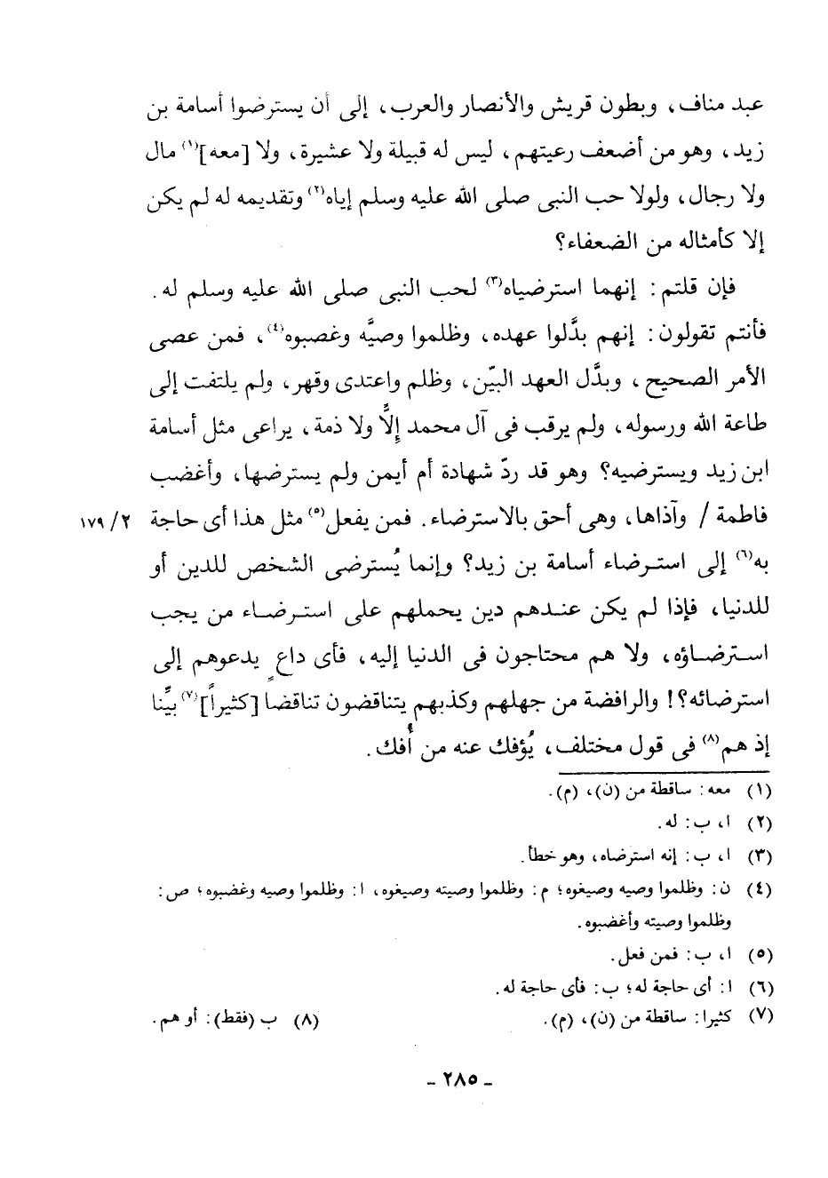 فَإِنْ قُلْتُمْ: إِنَّهُمَا اسْتَرْضَيَاهُ (¬3) لِحُبِّ النَّبِيِّ - صَلَّى اللَّهُ عَلَيْهِ وَسَلَّمَ - لَهُ، فَأَنْتُمْ تَقُولُونَ: إِنَّهُمْ بَدَّلُوا عَهْدَهُ، وَظَلَمُوا وَصِيَّهُ وَغَصَبُوهُ (¬4) ، فَمَنْ عَصَى الْأَمْرَ الصَّحِيحَ، وَبَدَّلَ الْعَهْدَ الْبَيِّنَ، وَظَلَمَ وَاعْتَدَى وَقَهَرَ، وَلَمْ يَلْتَفِتْ إِلَى طَاعَةِ اللَّهِ وَرَسُولِهِ، وَلَمْ يَرْقُبْ فِي آلِ مُحَمَّدٍ إِلًّا وَلَا ذِمَّةً، يُرَاعِي مِثْلَ أُسَامَةَ بْنِ زَيْدٍ وَيَسْتَرْضِيهِ؟ وَهُوَ قَدْ رَدَّ شَهَادَةَ أُمِّ أَيْمَنَ وَلَمْ يَسْتَرْضِهَا، وَأَغْضَبَ فَاطِمَةَ وَآذَاهَا، وَهِيَ أَحَقُّ بِالِاسْتِرْضَاءِ. فَمَنْ يَفْعَلُ (¬5) مِثْلَ هَذَا أَيُّ حَاجَةٍ بِهِ (¬6) إِلَى اسْتِرْضَاءِ أُسَامَةَ بْنِ زَيْدٍ؟ وَإِنَّمَا يُسْتَرْضَى الشَّخْصُ لِلدِّينِ أَوْ لِلدُّنْيَا، فَإِذَا لَمْ يَكُنْ عِنْدَهُمْ دِينٌ يَحْمِلُهُمْ عَلَى اسْتِرْضَاءِ مَنْ يَجُبُ اسْتِرْضَاؤُهُ، وَلَا هُمْ مُحْتَاجُونَ فِي الدُّنْيَا إِلَيْهِ، فَأَيُّ دَاعٍ يَدْعُوهُمْ إِلَى اسْتِرْضَائِهِ؟ وَلَا هُمْ مُحْتَاجُونَ فِي الدُّنْيَا إِلَيْهِ، فَأَيُّ دَاعٍ يَدْعُوهُمْ إِلَى اسْتِرْضَائِهِ؟ وَالرَّافِضَةُ مِنْ جَهْلِهِمْ وَكَذِبِهِمْ يَتَنَاقَضُونَ تَنَاقُضًا [كَثِيرًا] (¬7) بَيِّنًا إِذْ هُمْ (¬8) فِي قَوْلٍ مُخْتَلِفٍ، يُؤْفَكُ عَنْهُ مَنْ أُفِكَ.