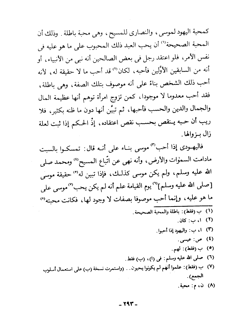 كَمَحَبَّةِ الْيَهُودِ لِمُوسَى، وَالنَّصَارَى لِلْمَسِيحِ، وَهِيَ مَحَبَّةٌ بَاطِلَةٌ. وَذَلِكَ أَنَّ الْمَحَبَّةَ الصَّحِيحَةَ (¬1) أَنْ يُحِبَّ الْعَبْدُ ذَلِكَ الْمَحْبُوبَ عَلَى مَا هُوَ عَلَيْهِ فِي نَفْسِ الْأَمْرِ، فَلَوِ اعْتَقَدَ رَجُلٌ فِي بَعْضِ الصَّالِحِينَ أَنَّهُ نَبِيٌّ مِنَ الْأَنْبِيَاءِ، أَوْ أَنَّهُ مِنَ السَّابِقِينَ الْأَوَّلِينَ فَأَحَبَّهُ، (¬2) قَدْ أَحَبَّ مَا لَا حَقِيقَةَ لَهُ ; لِأَنَّهُ أَحَبَّ ذَلِكَ الشَّخْصَ بِنَاءً عَلَى أَنَّهُ مَوْصُوفٌ بِتِلْكَ الصِّفَةِ، وَهِيَ بَاطِلَةٌ، فَقَدْ أَحَبَّ مَعْدُومًا لَا مَوْجُودًا، كَمَنْ تَزَوَّجَ امْرَأَةً تَوَهَّمَ أَنَّهَا عَظِيمَةُ الْمَالِ وَالْجَمَالِ وَالدِّينِ وَالْحَسَبِ فَأَحَبَّهَا، ثُمَّ تَبَيَّنَ أَنَّهَا دُونَ مَا ظَنَّهُ بِكَثِيرٍ، فَلَا رَيْبَ أَنَّ حُبَّهُ يَنْقُصُ بِحَسَبِ نَقْصِ اعْتِقَادِهِ، إِذِ الْحُكْمُ إِذَا ثَبَتَ لِعِلَّةٍ زَالَ بِزَوَالِهَا.