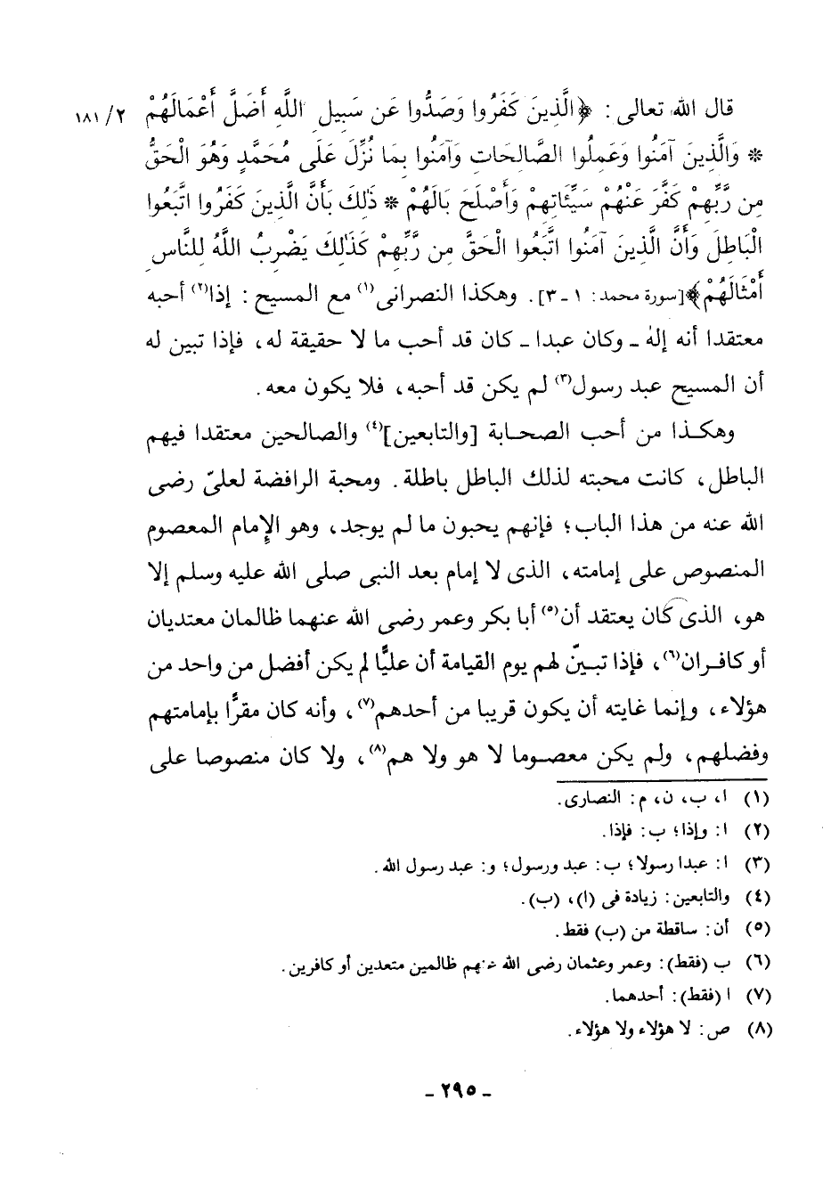 وَهَكَذَا مَنْ أَحَبَّ الصَّحَابَةَ [وَالتَّابِعِينَ] (¬4) وَالصَّالِحِينَ مُعْتَقِدًا فِيهِمُ الْبَاطِلَ، كَانَتْ مَحَبَّتُهُ لِذَلِكَ الْبَاطِلِ بَاطِلَةً. وَمَحَبَّةُ الرَّافِضَةِ لِعَلِيٍّ - رَضِيَ اللَّهُ عَنْهُ - مِنْ هَذَا الْبَابِ ; فَإِنَّهُمْ يُحِبُّونَ مَا لَمْ يُوجَدْ، وَهُوَ الْإِمَامُ الْمَعْصُومُ الْمَنْصُوصُ عَلَى إِمَامَتِهِ، الَّذِي لَا إِمَامَ بَعْدَ النَّبِيِّ - صَلَّى اللَّهُ عَلَيْهِ وَسَلَّمَ - إِلَّا هُوَ، الَّذِي كَانَ يَعْتَقِدُ أَنَّ (¬5) أَبَا بَكْرٍ وَعُمَرَ - رَضِيَ اللَّهُ عَنْهُمَا - ظَالِمَانِ مُعْتَدِيَانِ أَوْ كَافِرَانِ (¬6) ، فَإِذَا تَبَيَّنَ لَهُمْ يَوْمَ الْقِيَامَةِ أَنَّ عَلِيًّا لَمْ يَكُنْ أَفْضَلَ مِنْ وَاحِدٍ مِنْ هَؤُلَاءِ، وَإِنَّمَا غَايَتُهُ أَنْ يَكُونَ قَرِيبًا مِنْ أَحَدِهِمْ (¬7) ، وَإِنَّهُ كَانَ مُقِرًّا بِإِمَامَتِهِمْ وَفَضْلِهِمْ، وَلَمْ يَكُنْ مَعْصُومًا لَا هُوَ وَلَا هُمْ (¬8) ، وَلَا كَانَ مَنْصُوصًا عَلَى