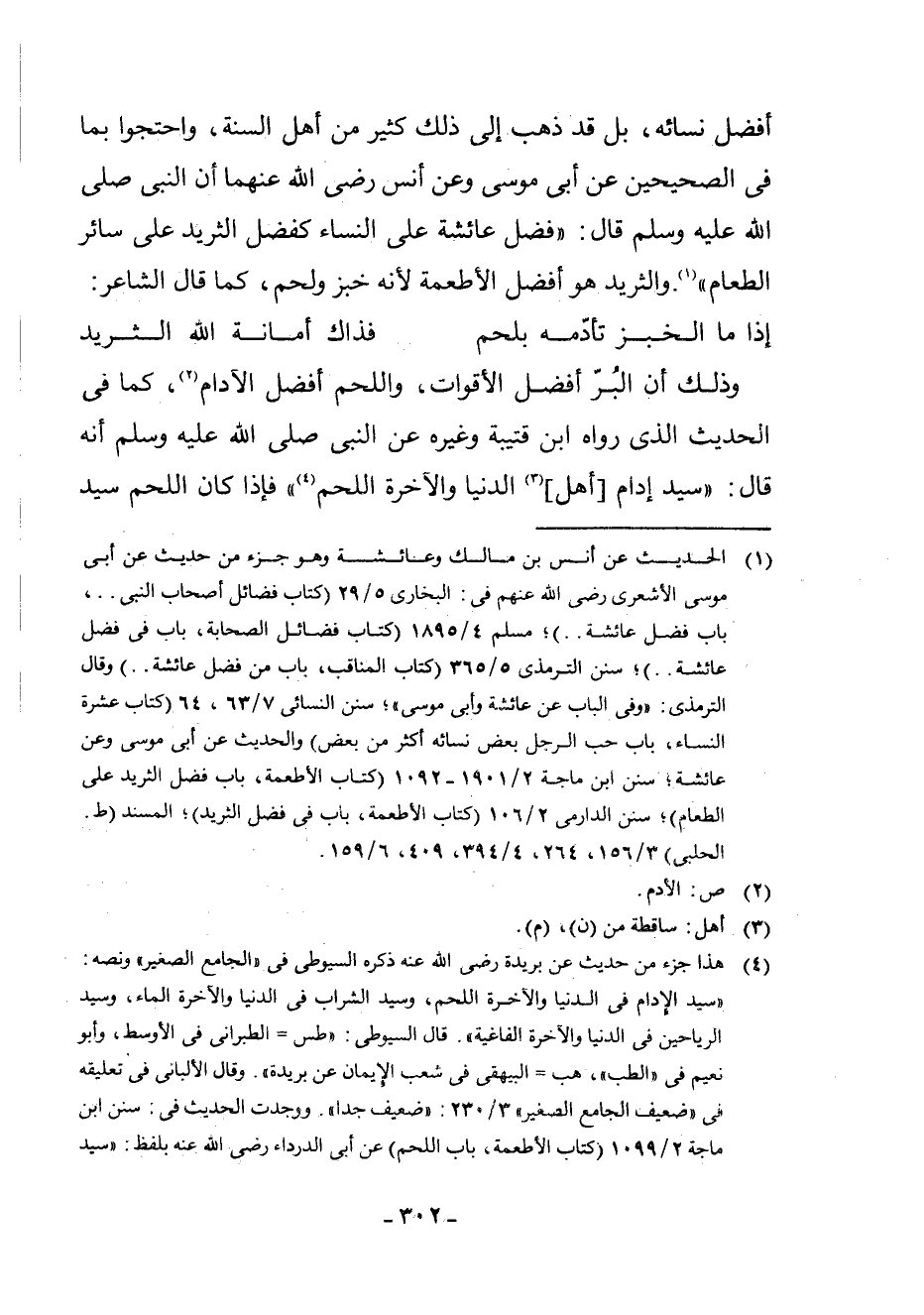 (¬1) الْحَدِيثُ عَنْ أَنَسِ بْنِ مَالِكٍ وَعَائِشَةَ وَهُوَ جُزْءٌ مِنْ حَدِيثٍ عَنْ أَبِي مُوسَى الْأَشْعَرِيِّ - رَضِيَ اللَّهُ عَنْهُمْ - فِي: الْبُخَارِيِّ 5/29 (كِتَابُ فَضَائِلِ أَصْحَابِ النَّبِيِّ. .، بَابُ فَضْلِ عَائِشَةَ. .) ; مُسْلِمٍ 4/1895 (كِتَابُ فَضَائِلِ الصَّحَابَةِ، بَابُ فَضْلِ عَائِشَةَ. .) ، سُنَنِ التِّرْمِذِيِّ 5/365 (كِتَابُ الْمَنَاقِبِ، بَابٌ مِنْ فَضْلِ عَائِشَةَ. .) وَقَالَ التِّرْمِذِيُّ: " وَفِي الْبَابِ عَنْ عَائِشَةَ وَأَبِي مُوسَى " ; سُنَنِ النَّسَائِيِّ 7/63، 64 (كِتَابُ عِشْرَةِ النِّسَاءِ، بَابُ حُبِّ الرَّجُلِ بَعْضَ نِسَائِهِ أَكْثَرَ مِنْ بَعْضٍ) وَالْحَدِيثُ عَنْ أَبِي مُوسَى وَعَنْ عَائِشَةَ ; سُنَنِ ابْنِ مَاجَهْ 2/1901 1092 (كِتَابُ الْأَطْعِمَةِ، بَابُ فَضْلِ الثَّرِيدِ عَلَى الطَّعَامِ) ; سُنَنِ الدَّارِمِيِّ 2/106 (كِتَابُ الْأَطْعِمَةِ، بَابٌ فِي فَضْلِ الثَّرِيدِ) ; الْمُسْنَدِ (ط. الْحَلَبِيِّ) 3/156، 264، 4/394، 409، 6/159.
