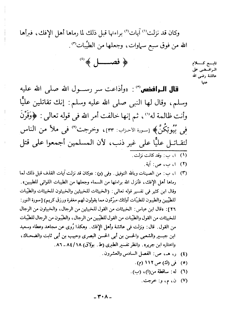 (¬3) أ، ب: مِنَ الصَّيِّنَاتِ وَبِاللَّهِ التَّوْفِيقُ، وَفِي (وَ) : " وَكَانَ قَدْ نَزَلَتْ آيَاتُ الْقَذْفِ قَبْلَ ذَلِكَ لَمَّا رَمَاهَا أَهْلُ الْإِفْكِ، فَأَنْزَلَ اللَّهُ بَرَاءَتَهَا مِنَ السَّمَاءِ وَجَعَلَهَا مِنَ الطَّيِّبَاتِ اللَّوَاتِي لِلطَّيِّبِينَ ". وَقَالَ ابْنُ كَثِيرٍ فِي تَفْسِيرِ قَوْلِهِ تَعَالَى: (الْخَبِيثَاتُ لِلْخَبِيثِينَ وَالْخَبِيثُونَ لِلْخَبِيثَاتِ وَالطَّيِّبَاتُ لِلطَّيِّبِينَ وَالطَّيِّبُونَ لِلطَّيِّبَاتِ أُولَئِكَ مُبَرَّءُونَ مِمَّا يَقُولُونَ لَهُمْ مَغْفِرَةٌ وَرِزْقٌ كَرِيمٌ) [سُورَةُ النُّورِ: 26] : " قَالَ ابْنُ عَبَّاسٍ: الْخَبِيثَاتُ مِنَ الْقَوْلِ لِلْخَبِيثِينَ مِنَ الرِّجَالِ، وَالْخَبِيثُونَ مِنَ الرِّجَالِ لِلْخَبِيثَاتِ مِنَ الْقَوْلِ وَالطَّيِّبَاتُ مِنَ الْقَوْلِ لِلطَّيِّبِينَ مِنَ الرِّجَالِ، وَالطَّيِّبُونَ مِنَ الرِّجَالِ لِلطَّيِّبَاتِ مِنَ الْقَوْلِ. قَالَ: وَنَزَلَتْ فِي عَائِشَةَ وَأَهْلِ الْإِفْكِ. وَهَكَذَا رُوِيَ عَنْ مُجَاهِدٍ وَعَطَاءٍ وَسَعِيدِ بْنِ جُبَيْرٍ وَالشَّعْبِيِّ وَالْحَسَنِ بْنِ أَبِي الْحَسَنِ الْبَصْرِيِّ وَحَبِيبِ بْنِ أَبِي ثَابِتٍ وَالضَّحَّاكِ، وَاخْتَارَهُ ابْنُ جَرِيرٍ ". وَانْظُرْ تَفْسِيرَ الطَّبَرِيِّ (ط. بُولَاقٍ) 18/84 - 86.