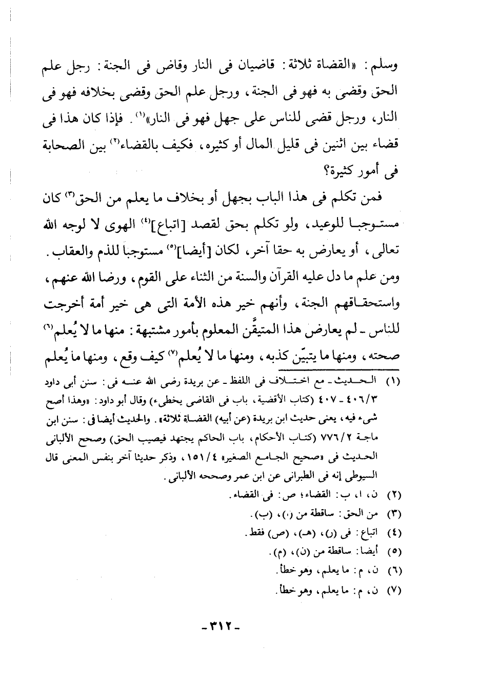 وَسَلَّمَ -: " «الْقُضَاةُ ثَلَاثَةٌ: قَاضِيَانِ فِي النَّارِ وَقَاضٍ فِي الْجَنَّةِ: رَجُلٌ عَلِمَ الْحَقَّ وَقَضَى بِهِ فَهُوَ فِي الْجَنَّةِ، وَرَجُلٌ عَلِمَ الْحَقَّ وَقَضَى بِخِلَافِهِ فَهُوَ فِي النَّارِ، وَرَجُلٌ قَضَى لِلنَّاسِ عَلَى جَهْلٍ فَهُوَ فِي النَّارِ» " (¬1)