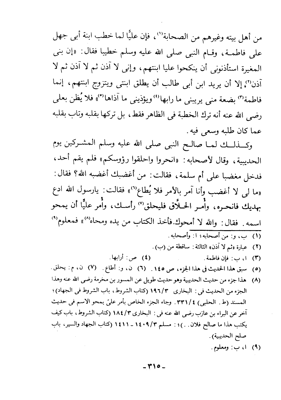 (¬7) هَذَا جُزْءٌ مِنْ حَدِيثِ الْحُدَيْبِيَةِ وَهُوَ حَدِيثٌ طَوِيلٌ عَنِ الْمِسْوَرِ بْنِ مَخْرَمَةَ - رَضِيَ اللَّهُ عَنْهُ - وَهَذَا الْجُزْءُ مِنَ الْحَدِيثِ فِي: الْبُخَارِيِّ 3/196 (كِتَابُ الشُّرُوطِ، بَابُ الشُّرُوطِ فِي الْجِهَادِ) ; الْمُسْنَدِ (ط. الْحَلَبِيِّ) 4/331. وَجَاءَ الْجُزْءُ الْخَاصُّ بِأَمْرِ عَلِيٍّ بِمَحْوِ الِاسْمِ فِي حَدِيثٍ آخَرَ عَنِ الْبَرَاءِ بْنِ عَازِبٍ - رَضِيَ اللَّهُ عَنْهُ - فِي: الْبُخَارِيِّ 3/184 (كِتَابُ الشُّرُوطِ، بَابٌ كَيْفَ يَكْتُبُ هَذَا مَا صَالَحَ فُلَانٌ. .) ; مُسْلِمٍ 3/1409 - 1411 (كِتَابُ الْجِهَادِ وَالسِّيَرِ، بَابُ صُلْحِ الْحُدَيْبِيَةِ) .