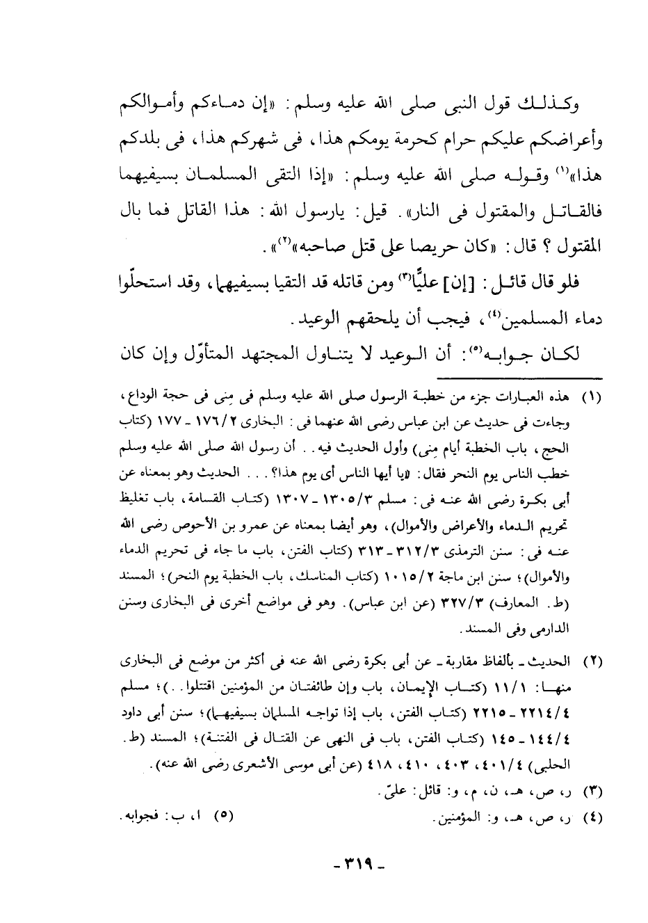 (¬1) هَذِهِ الْعِبَارَاتُ جُزْءٌ مِنْ خُطْبَةِ الرَّسُولِ - صَلَّى اللَّهُ عَلَيْهِ وَسَلَّمَ - فِي مِنًى فِي حَجَّةِ الْوَدَاعِ، وَجَاءَتْ فِي حَدِيثٍ عَنِ ابْنِ عَبَّاسٍ - رَضِيَ اللَّهُ عَنْهُمَا - فِي الْبُخَارِيِّ 2/176 - 177 (كِتَابُ الْحَجِّ، بَابُ الْخُطْبَةِ أَيَّامَ مِنًى) وَأَوَّلُ الْحَدِيثِ فِيهِ. . أَنَّ رَسُولَ اللَّهِ - صَلَّى اللَّهُ عَلَيْهِ وَسَلَّمَ - خَطَبَ النَّاسَ يَوْمَ النَّحْرِ فَقَالَ: " يَا أَيُّهَا النَّاسُ أَيُّ يَوْمٍ هَذَا؟ . . . الْحَدِيثَ وَهُوَ بِمَعْنَاهُ عَنْ أَبِي بَكْرٍ - رَضِيَ اللَّهُ عَنْهُ - فِي مُسْلِمٍ 3/1305 - 1307 (كِتَابُ الْقَسَامَةِ، بَابُ تَغْلِيظِ تَحْرِيمِ الدِّمَاءِ وَالْأَعْرَاضِ وَالْأَمْوَالِ) ، وَهُوَ أَيْضًا بِمَعْنَاهُ عَنْ عَمْرِو بْنِ الْأَحْوَصِ - رَضِيَ اللَّهُ عَنْهُ - فِي: سُنَنِ التِّرْمِذِيِّ 3/312 - 313 (كِتَابُ الْفِتَنِ، بَابُ مَا جَاءَ فِي تَحْرِيمِ الدِّمَاءِ وَالْأَمْوَالِ) ; سُنَنِ ابْنِ مَاجَهْ 2/1015 (كِتَابُ الْمَنَاسِكِ، بَابُ الْخُطْبَةِ يَوْمَ النَّحْرِ) ; الْمُسْنَدِ (ط. الْمَعَارِفِ) 3/327 (عَنِ ابْنِ عَبَّاسٍ) . وَهُوَ فِي مَوَاضِعَ أُخْرَى فِي الْبُخَارِيِّ وَسُنَنِ الدَّارِمِيِّ وَفِي الْمُسْنَدِ.
