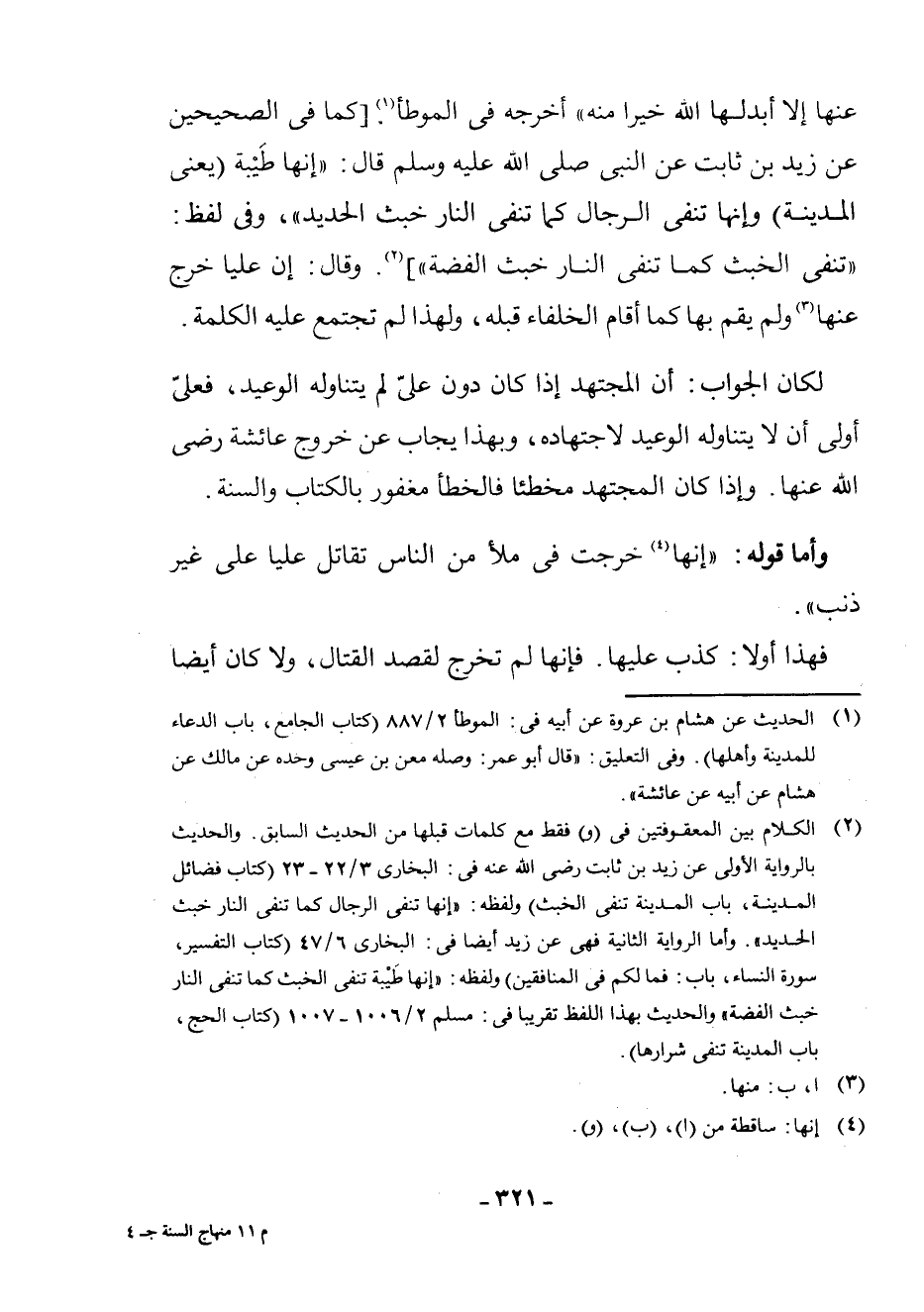 لَكَانَ الْجَوَابُ: أَنَّ الْمُجْتَهِدَ إِذَا كَانَ دُونَ عَلِيٍّ لَمْ يَتَنَاوَلْهُ الْوَعِيدُ، فَعَلِيٌّ أَولَى أَنْ لَا يَتَنَاوَلَهُ الْوَعِيدُ لِاجْتِهَادِهِ، وَبِهَذَا يُجَابُ عَنْ خُرُوجِ عَائِشَةَ - رَضِيَ اللَّهُ عَنْهَا -. وَإِذَا كَانَ الْمُجْتَهِدُ مُخْطِئًا فَالْخَطَأُ مَغْفُورٌ بِالْكِتَابِ وَالسُّنَّةِ.
