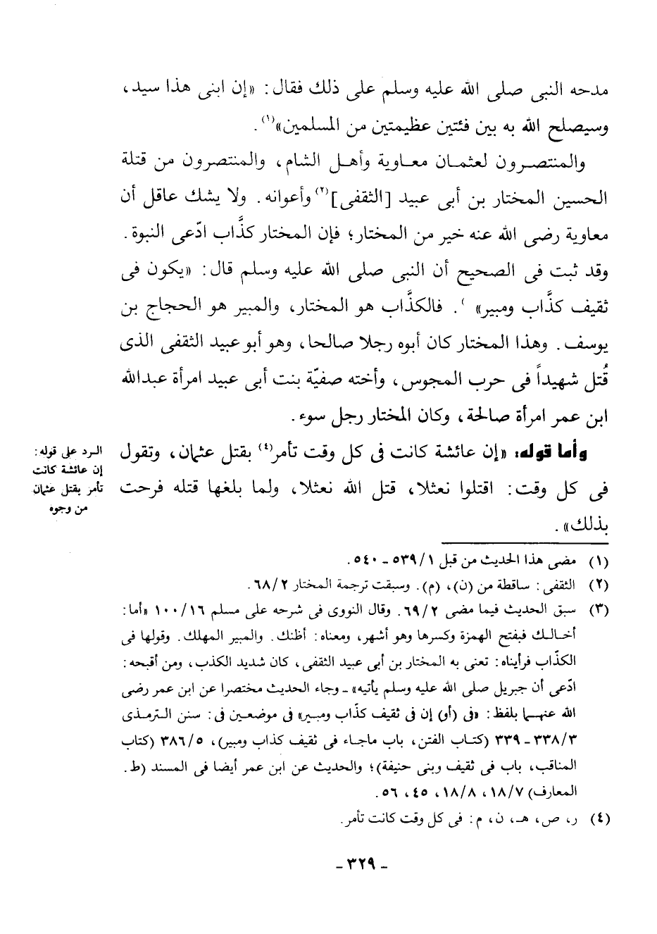 (¬4) سَبَقَ الْحَدِيثُ فِيمَا مَضَى 2. وَقَالَ النَّوَوِيُّ فِي شَرْحِهِ عَلَى مُسْلِمٍ 16/100 " أَمَّا: أَخَالُكَ فَبِفَتْحِ الْهَمْزَةِ وَكَسْرِهَا وَهُوَ أَشْهَرُ، وَمَعْنَاهُ: أَظُنُّكَ. وَالْمُبِيرُ الْمُهْلِكُ. وَقَوْلُهَا فِي الْكَذَّابِ: فَرَأَيْنَاهُ، تَعْنِي بِهِ الْمُخْتَارَ بْنَ أَبِي عُبَيْدٍ الثَّقَفِيَّ، كَانَ شَدِيدَ الْكَذِبِ، وَمِنْ أَقْبَحِهِ: ادَّعَى أَنَّ جِبْرِيلَ - صَلَّى اللَّهُ عَلَيْهِ وَسَلَّمَ - يَأْتِيهِ " - وَجَاءَ الْحَدِيثُ مُخْتَصَرًا عَنِ ابْن عُمَرَ - رَضِيَ اللَّهُ عَنْهُمَا - بِلَفْظٍ: " فِي (أَوْ) إِنَّ فِي ثَقِيفٍ كَذَّابٌ وَمُبِيرٌ " فِي مَوْضِعَيْنِ فِي: سُنَنِ التِّرْمِذِيِّ 3/338 - 339 (كِتَابُ الْفِتَنِ، بَابُ مَا جَاءَ فِي ثَقِيفٍ كَذَّابٌ وَمُبِيرٌ) ، 5/386 (كِتَابُ الْمَنَاقِبِ، بَابٌ فِي ثَقِيفٍ وَبَنِي حَنِيفَةَ) ; وَالْحَدِيثُ عَنِ ابْنِ عُمَرَ أَيْضًا فِي الْمُسْنَدِ (ط. الْمَعَارِفِ) 7/18، 8/18، 45، 56.