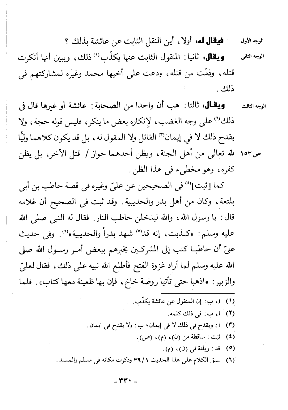 وَيُقَالُ: ثَالِثًا: هَبْ أَنَّ وَاحِدًا مِنَ الصَّحَابَةِ: عَائِشَةَ أَوْ غَيْرَهَا قَالَ فِي ذَلِكَ (¬2) عَلَى وَجْهِ الْغَضَبِ، لِإِنْكَارِهِ بَعْضَ مَا يُنْكَرُ، فَلَيْسَ قَوْلُهُ حُجَّةً، وَلَا يَقْدَحُ ذَلِكَ لَا فِي إِيمَانِ (¬3) الْقَائِلِ وَلَا الْمَقُولِ لَهُ، بَلْ قَدْ يَكُونُ كِلَاهُمَا وَلِيًّا لِلَّهِ تَعَالَى مِنْ أَهْلِ الْجَنَّةِ، وَيَظُنُّ أَحَدُهُمَا جَوَازَ قَتْلِ الْآخَرِ، بَلْ يَظُنُّ كُفْرَهُ، وَهُوَ مُخْطِئٌ فِي هَذَا الظَّنِّ.