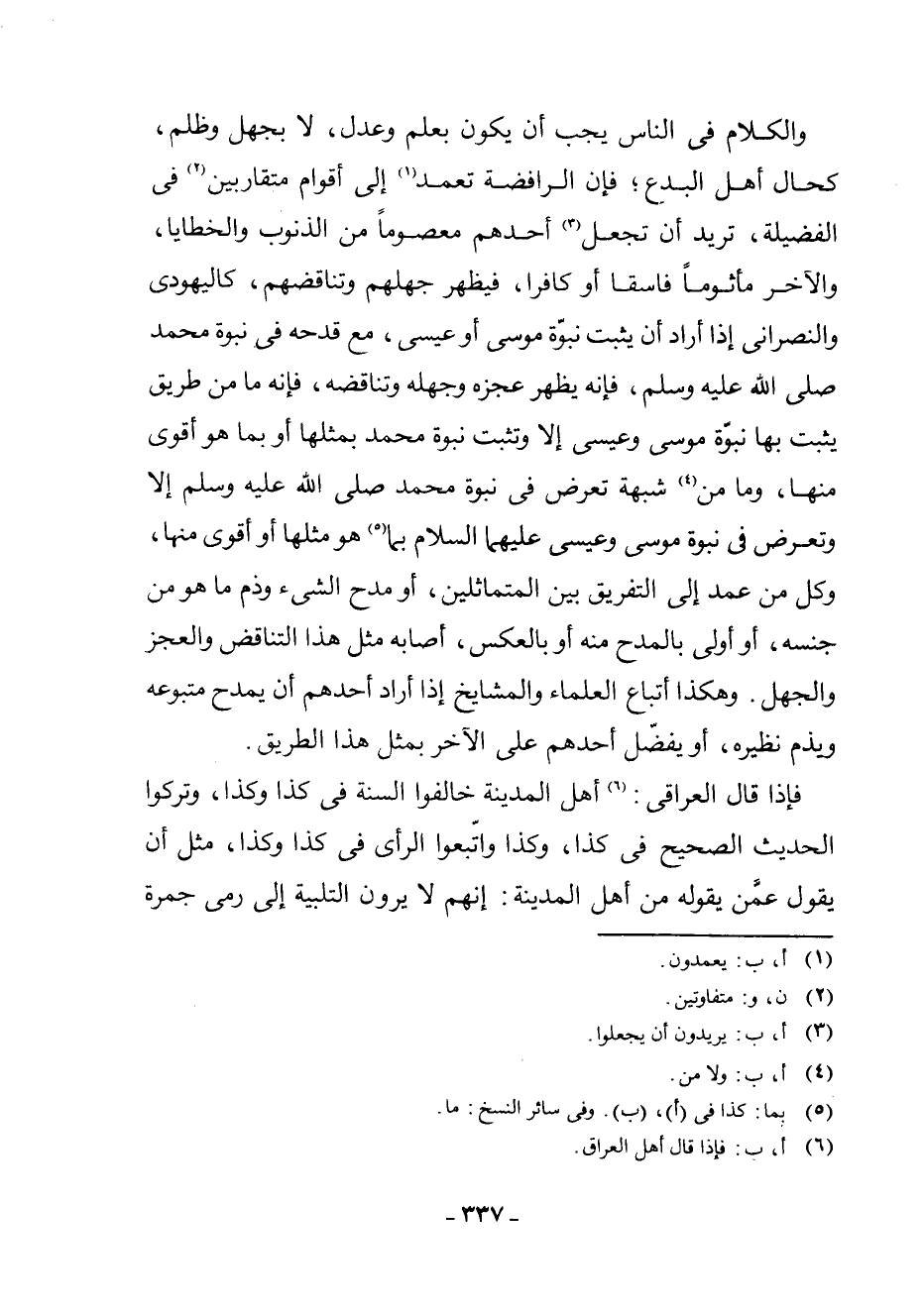 وَالْكَلَامُ فِي النَّاسِ يَجِبُ أَنْ يَكُونَ بِعِلْمٍ وَعَدْلٍ، لَا بِجَهْلٍ وَظُلْمٍ، كَحَالِ أَهْلِ الْبِدَعِ ; فَإِنَّ الرَّافِضَةَ تَعْمِدُ (¬1) إِلَى أَقْوَامٍ مُتَقَارِبِينَ (¬2) فِي الْفَضِيلَةِ، تُرِيدُ أَنْ تَجْعَلَ (¬3) أَحَدَهُمْ مَعْصُومًا مِنَ الذُّنُوبِ وَالْخَطَايَا، وَالْآخَرَ مَأْثُومًا فَاسِقًا أَوْ كَافِرًا، فَيَظْهَرُ جَهْلُهُمْ وَتَنَاقُضُهُمْ، كَالْيَهُودِيِّ وَالنَّصْرَانِيِّ إِذَا أَرَادَ أَنْ يُثْبِتَ نُبُوَّةَ مُوسَى أَوْ عِيسَى، مَعَ قَدْحِهِ فِي نُبُوَّةِ مُحَمَّدٍ - صَلَّى اللَّهُ عَلَيْهِ وَسَلَّمَ - فَإِنَّهُ يَظْهَرُ عَجْزُهُ وَجَهْلُهُ وَتَنَاقُضُهُ، فَإِنَّهُ مَا مِنْ طَرِيقٍ يُثْبِتُ بِهَا نُبُوَّةَ مُوسَى وَعِيسَى إِلَّا وَتَثْبُتُ نُبُوَّةُ مُحَمَّدٍ - صَلَّى اللَّهُ عَلَيْهِ وَسَلَّمَ - بِمِثْلِهَا أَوْ بِمَا هُوَ أَقْوَى مِنْهَا، وَمَا مِنْ (¬4) شُبْهَةٍ تَعْرِضُ عَلَى نُبُوَّةِ مُحَمَّدٍ - صَلَّى اللَّهُ عَلَيْهِ وَسَلَّمَ - إِلَّا وَتَعْرِضُ فِي نُبُوَّةِ مُوسَى وَعِيسَى - عَلَيْهِمَا السَّلَامُ - بِمَا (¬5) هُوَ مِثْلُهَا أَوْ أَقْوَى مِنْهَا، وَكُلُّ مَنْ عَمَدَ إِلَى التَّفْرِيقِ بَيْنَ الْمُتَمَاثِلَيْنِ، أَوْ مَدْحِ الشَّيْءِ وَذَمِّ مَا هُوَ مَنْ جِنْسِهِ، أَوْ أَوْلَى بِالْمَدْحِ مِنْهُ أَوْ بِالْعَكْسِ، أَصَابَهُ مِثْلُ هَذَا التَّنَاقُضِ وَالْعَجْزِ وَالْجَهْلِ. وَهَكَذَا أَتْبَاعُ الْعُلَمَاءِ وَالْمَشَايِخِ إِذَا أَرَادَ أَحَدُهُمْ أَنْ يَمْدَحَ مَتْبُوعَهُ وَيَذُمَّ نَظِيرَهُ، أَوْ يُفَضِّلَ أَحَدَهُمْ عَلَى الْآخَرِ بِمِثْلِ هَذَا الطَّرِيقِ.
