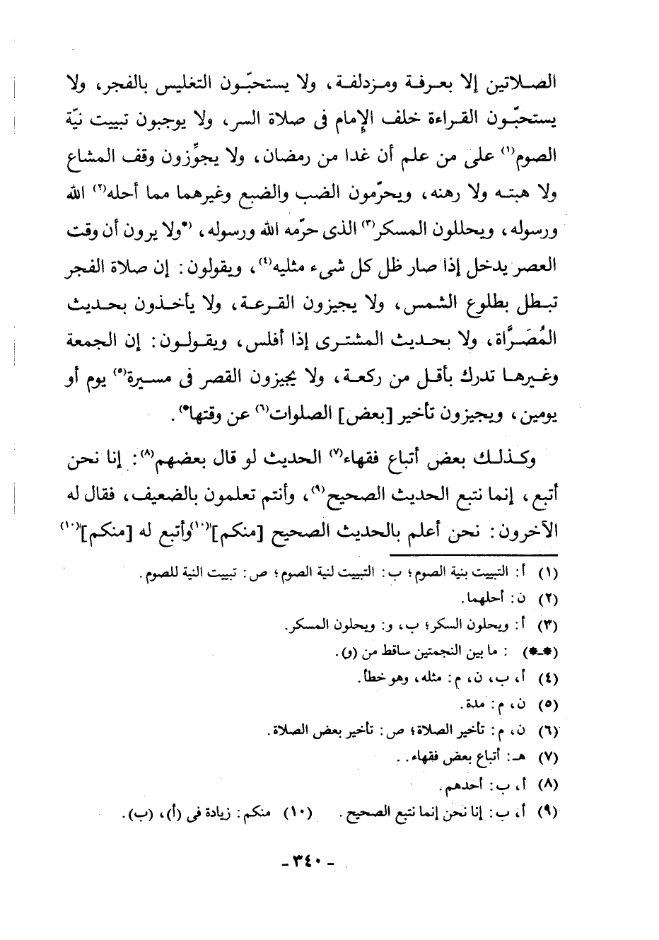 الصَّلَاتَيْنِ إِلَّا بِعَرَفَةَ وَمُزْدَلِفَةَ، وَلَا يَسْتَحِبُّونَ التَّغْلِيسَ بِالْفَجْرِ، وَلَا يَسْتَحِبُّونَ الْقِرَاءَةَ خَلْفَ الْإِمَامِ فِي صَلَاةِ السِّرِّ، وَلَا يُوجِبُونَ تَبْيِيتَ نِيَّةِ الصَّوْمِ (¬1) عَلَى مَنْ عَلِمَ أَنَّ غَدًا مِنْ رَمَضَانَ، وَلَا يُجَوِّزُونَ وَقْفَ الْمُشَاعِ وَلَا هِبَتَهُ وَلَا رَهْنَهُ، وَيُحَرِّمُونَ الضَّبَّ وَالضَّبُعَ وَغَيْرَهُمَا مِمَّا أَحَلَّهُ (¬2) اللَّهُ وَرَسُولُهُ، وَيُحَلِّلُونَ الْمُسْكِرَ (¬3) الَّذِي حَرَّمَهُ اللَّهُ وَرَسُولُهُ، * وَلَا يَرَوْنَ أَنَّ وَقْتَ الْعَصْرِ يَدْخُلُ إِذَا صَارَ ظِلُّ كُلِّ شَيْءٍ مِثْلَيْهِ (¬4) ، وَيَقُولُونَ: إِنَّ صَلَاةَ الْفَجْرِ تَبْطُلُ بِطُلُوعِ الشَّمْسِ، وَلَا يُجِيزُونَ الْقُرْعَةَ، وَلَا يَأْخُذُونَ بِحَدِيثِ الْمُصَرَّاةِ، وَلَا بِحَدِيثِ الْمُشْتَرِي إِذَا أَفْلَسَ، وَيَقُولُونَ: إِنَّ الْجُمُعَةَ وَغَيْرَهَا تُدْرَكُ بِأَقَلِّ مِنْ رَكْعَةٍ، وَلَا يُجِيزُونَ الْقَصْرَ فِي مَسِيرَةِ (¬5) يَوْمٍ أَوْ يَوْمَيْنِ، وَيُجِيزُونَ تَأْخِيرَ [بَعْضِ] الصَّلَوَاتِ (¬6) عَنْ وَقْتِهَا * (¬7) .