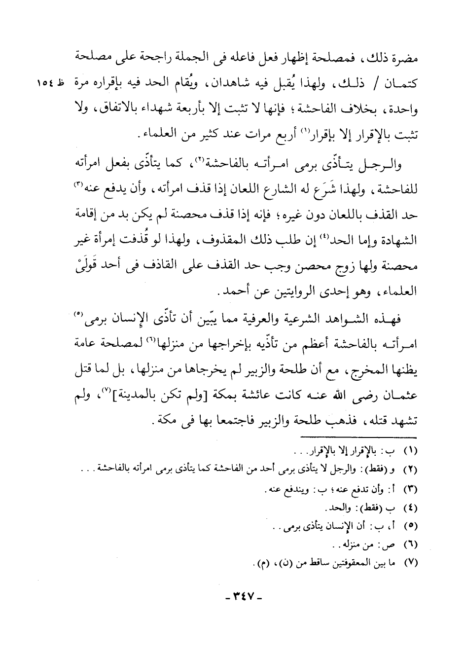 (¬2) و (فَقَطْ) : وَالرَّجُلُ لَا يَتَأَذَّى بِرَمْيِ أَحَدٍ مِنَ الْفَاحِشَةِ كَمَا يَتَأَذَّى بِرَمْيِ امْرَأَتِهِ بِالْفَاحِشَةِ. . .